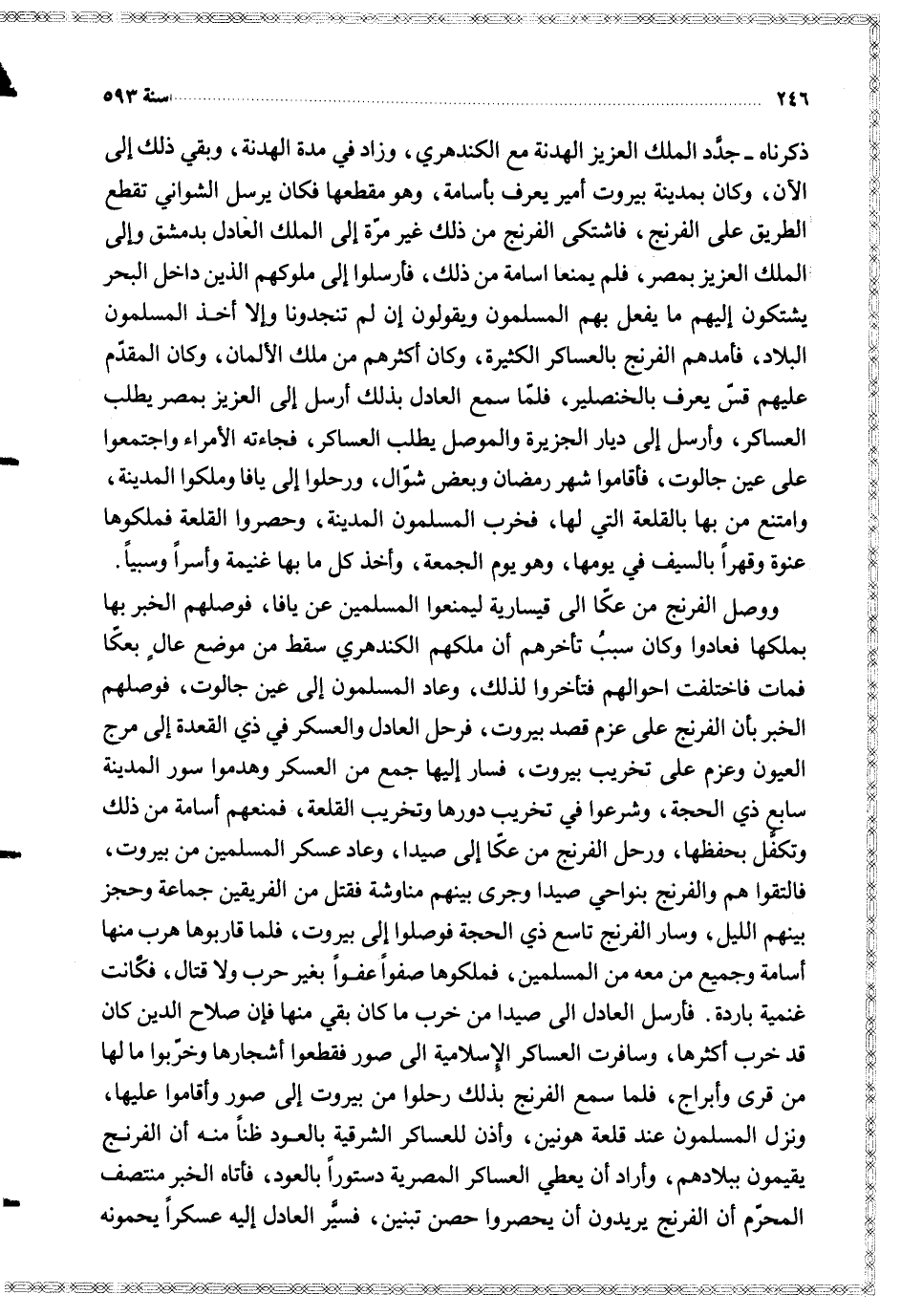 - ذكرناه جدد الملك العزيز الهدنة مع الكندهري وزاد في مدة الهدنة وبقي ذلك إلى الآن وكان بمدينة بيروت أمير يعرف بأسامة وهو مقطعها فكان يرسل الشواني تقطع الطريق على الفرنج فاشتكى الفرنج من ذلك غير مرة إلى الملك العادل بدمشق وإلى الملك العزيز بمصر فلم يمنعا اسامة من ذلك فأرسلوا إلى ملوكهم الذين داخل البحر يشتكون إليهم ما يفعل بهم المسلمون ويقولون إن لم تنجدونا وإلا أخذ المسلمون البلاد فأمدهم الفرنج بالعساكر الكثيرة وكان أكثرهم من ملك الألمان وكان المقدم عليهم قس يعرف بالخنصلير فلما سمع العادل بذلك أرسل إلى العزيز بمصر يطلب العساكر وأرسل إلى ديار الجزيرة والموصل يطلب العساكر فجاءته الأمراء واجتمعوا على عين جالوت فأقاموا شهر رمضان وبعض شوال ورحلوا إلى يافا وملكوا المدينة وامتنع من بها بالقلعة التي لها فخرب المسلمون المدينة وحصروا القلعة فملكوها عنوة وقهرا بالسيف في يومها وهو يوم الجمعة وأخذ كل ما بها غنيمة وأسرا وسببا