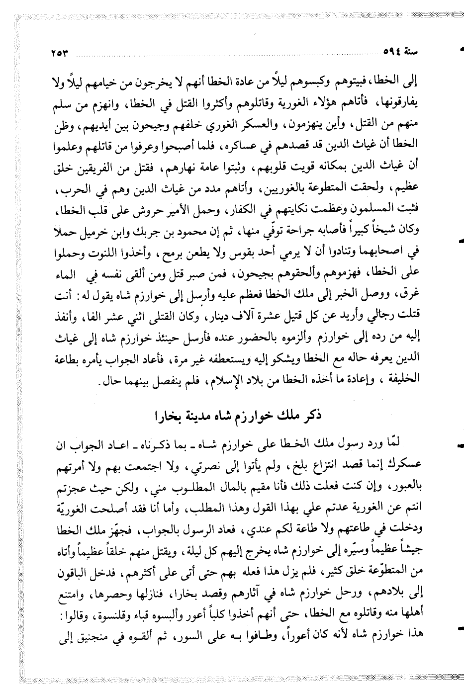 إلى الخطا فبيتوهم وكبسوهم ليلا من عادة الخطا أنهم لا يخرجون من خيامهم ليلا ولا يفارقونها فأتاهم هؤلاء الغورية وقاتلوهم وأكثروا القتل في الخطا وانهزم من سلم منهم من القتل وأين ينهزمون والعسكر الغوري خلفهم وجيحون بين أيديهم وظن الخطا أن غياث الدين قد قصدهم في عساكره فلما أصبحوا وعرفوا من قاتلهم وعلموا أن غياث الدين بمكانه قويت قلوبهم وثبتوا عامة نهارهم فقتل من الفريقين خلق عظيم ولحقت المتطوعة بالغوريين وأتاهم مدد من غياث الدين وهم في الحرب فثبت المسلمون وعظمت نكايتهم في الكفار وحمل الأمير حروش على قلب الخطا وكان شيخا كبيرا فأصابه جراحة توفي منها ثم إن محمود بن جربك وابن خرميل حملا في اصحابهما وتنادوا أن لا يرمي أحد بقوس ولا يطعن برمح وأخذوا اللنوت وحملوا على الخطا فهزموهم وألحقوهم بجيحون فمن صبر قتل ومن ألقى نفسه في الماء غرق ووصل الخبر إلى ملك الخطا فعظم عليه وأرسل إلى خوارزم شاه يقول له أنت قتلت رجالي وأريد عن كل قتيل عشرة آلاف دينار وكان القتلى اثني عشر الفا وأنفذ إليه من رده إلى خوارزم وألزموه بالحضور عنده فأرسل حينئذ خوارزم شاه إلى غياث الدين يعرفه حاله مع الخطا ويشكو إليه ويستعطفه غير مرة فأعاد الجواب يأمره بطاعة الخليقة وإعادة ما أخذه الخطا من بلاد الإسلام فلم ينفصل بينهما حال