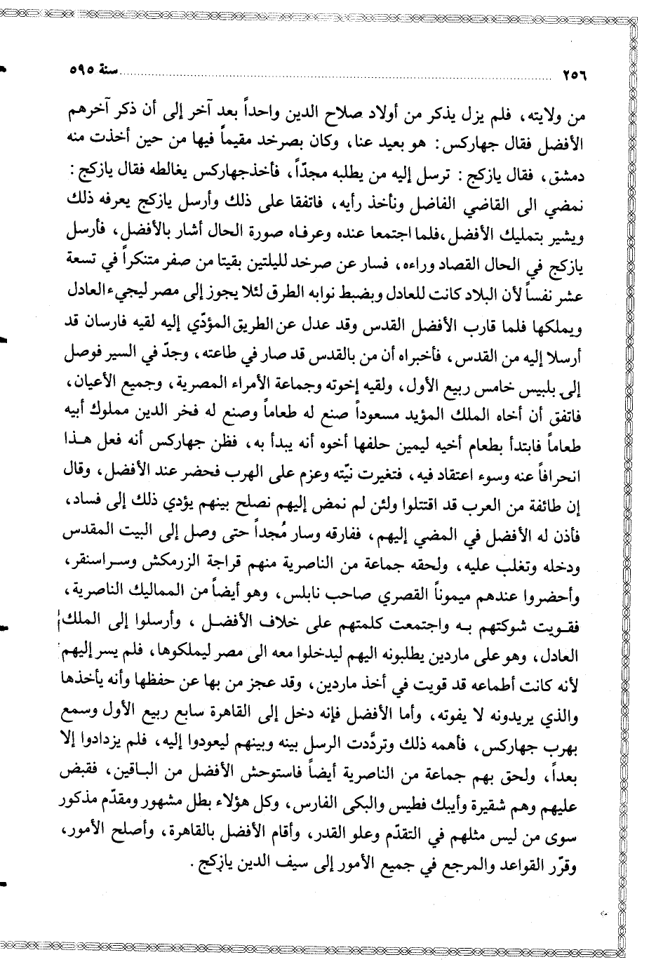 من ولايته فلم يزل يذكر من أولاد صلاح الدين واحدا بعد آخر إلى أن ذكر آخرهم الأفضل فقال جهاركس هو بعيد عنا وكان بصرخد مقيما فيها من حين أخذت منه دمشق فقال يازكج ترسل إليه من يطلبه مجدا فأخذ جهاركس يغالطه فقال يازكج نمضي الى القاضي الفاضل ونأخذ رأيه فاتفقا على ذلك وأرسل يازكج يعرفه ذلك ويشير بتمليك الأفضل فلما اجتمعا عنده وعرفاه صورة الحال أشار بالأفضل فأرسل يازكج في الحال القصاد وراء فسار عن صرخد لليلتين بقيتا من صفر متنكرا في تسعة عشر نفسا لأن البلاد كانت للعادل وبضبط نوابه الطرق لئلا يجوز إلى مصر ليجيء العادل ويملكها فلما قارب الأفضل القدس وقد عدل عن الطريق المؤدي إليه لقيه فارسان قد أرسلا إليه من القدس فأخبراه أن من بالقدس قد صار في طاعته وجد في السير فوصل إلى بلبيس خامس ربيع الأول ولقيه إخوته وجماعة الأمراء المصرية وجميع الأعيان فاتفق أن أخاه الملك المؤيد مسعودا صنع له طعاما وصنع له فخر الدين مملوك أبيه طعاما فابتدأ بطعام أخيه ليمين حلفها أخوه أنه يبدأ به فظن جهاركس أنه فعل هذا انحرافا عنه وسوء اعتقاد فيه فتغيرت نيته وعزم على الهرب فحضر عند الأفضل وقال إن طائفة من العرب قد اقتتلوا ولئن لم نمض إليهم نصلح بينهم يؤدي ذلك إلى فساد فأذن له الأفضل في المضي إليهم ففارقه وسار مجدا حتى وصل إلى البيت المقدس ودخله وتغلب عليه ولحقه جماعة من الناصرية منهم قراجة الزرمكش وسراسنقر وأحضروا عندهم ميمونا القصرى صاحب نابلس وهو أيضا من المماليك الناصرية فقويت سوكتهم به واجتمعت كلمتهم على خلاف الأفضل وأرسلوا إلى الملك العادل وهو على ماردين يطلبونه اليهم ليدخلوا معه الى مصر ليملكوها فلم يسر إليهم لأنه كانت أطماعه قد قويت في أخذ ماردين وقد عجز من بها عن حفظها وأنه يأخذها والذي يريدونه لا يفوته وأما الأفضل فإنه دخل إلى القاهرة سابع ربيه الأول وسمع بهرب جهاركس فأهمه ذلك وترددت الرسل بينه وبينهم ليعودوا إليه فلم يزدادوا إلا بعدا ولحق بهم حماعة من الناصرية أيضا فاستوحش الأفضل من الباقين فقبض عليهم وهم شقيرة وأيبك فطيس والبكى الفارس وكل هؤلاء بطل مشهور ومقدم مذكور سوى من ليس مثلهم في التقدم وعلو القدر وأقام الأفضل بالقاهرة وأصلح الأمور وقرر القواعد والمرجع في جميع الأمور إلى سيف الدين يازكج