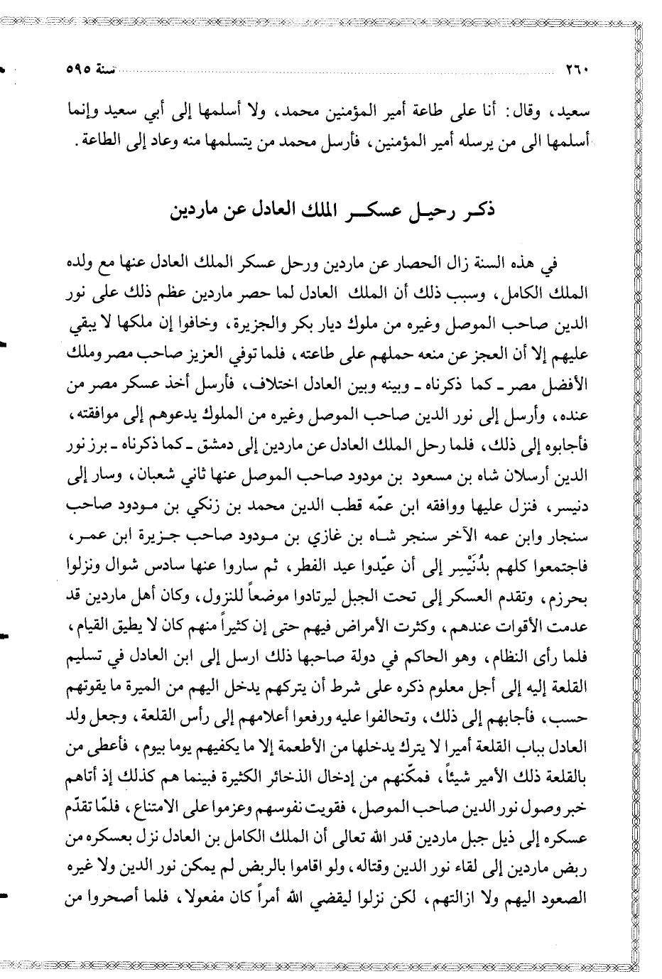 في هذه السنة زال الحصار عن ماردين ورحل عسكر الملك العادل عنها مع ولده الملك الكامل وسبب ذلك أن الملك العادل لما حصر ماردين عظم ذلك على نور الدين صاحب الموصل وغيره من ملوك ديار بكر والجزيرة وخافوا إن ملكها لا يبقي عليهم إلا أن العجز عن منعه حملهم على طاعته فلما توفي العزيز صاحب مصر وملك الأفضل مصر كما ذكرناه وبينه وبين العادل اختلاف فأرسل أخذ عسكر مصر من عنده وأرسل إلى نور الدين صاحب الموصل وغيره من الملوك يدعوهم إلى موافقته فأجابوه إلى ذلك فلما رحل الملك العادل عن ماردين إلى دمشق كما ذكرناه برز نور الدين أرسلان شاه بن مسعود بن مودود صاحب الموصل عنها ثاني شعبان وسار إلى دنيسر فنزل عليها ووافقه ابن عمه قطب الدين محمد بن زنكي بن مودود صاحب سنجار وابن عمه الآخر سنجر شاه بن غازي بن مودود صاحب جزيرة ابن عمر فاجتمعوا كلهم بدنيسر إلى أن عيدوا عيد الفطر ثم ساروا عنها سادس شوال ونزلوا بحرزم وتقدم العسكر إلى تحت الجبل ليرتادوا موضعا للنزول وكان أهل ماردين قد عدمت الأقوات عندهم وكثرت الأمراض فيهم حتى أن كثيرا منهم كان لا يطيق القيام فلما رأى النظام وهو الحاكم في دولة صاحبها ذلك ارسل إلى ابن العادل في تسليم القلعة إليه إلى أجل معلوم ذكره على شرط أن يتركهم يدخل اليهم من الميرة ما يقوتهم حسب فأجابهم إلى ذلك وتحالفوا عليه ورفعوا أعلامهم إلى رأس القلعة وجعل ولد العادل بباب القلعة أميرا لا يترك يدخلها من الأطعمة إلا ما يكفيهم يوما بيوم فأعطى من بالقلعة ذلك الأمير شيئا فمكنهم من إدخال الذخائر الكثيرة فبينما هم كذلك إذ أتاهم خبر وصول نور الدين صاحب الموصل فقويت نفوسهم وعزموا على الامتناع فلما تقدم عسكره إلى ذيل جبل ماردين قدر الله تعالى أن الملك الكامل بن العادل نزل بعسكره من ربض ماردين إلى لقاء نور الدين وقتاله ولو اقاموا بالربض لم يمكن نور الدين ولا غيره الصعود اليهم ولا ازالتهم لكن نزلوا ليقضي الله أمرا كان مفعولا فلما أصحروا من