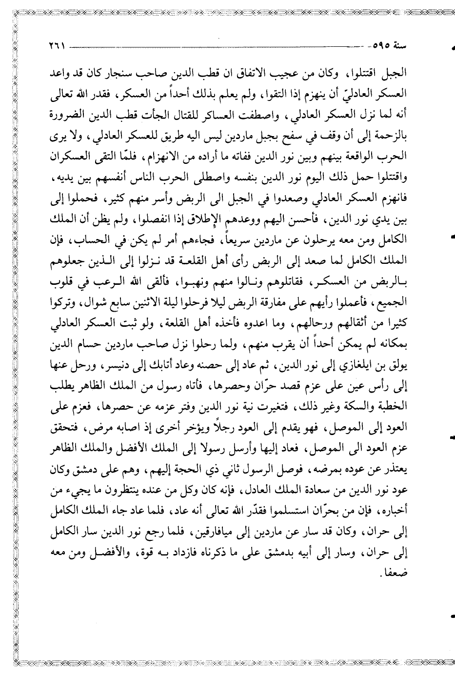 الجبل اقتتلوا وكان من عجيب الاتفاق ان قطب الدين صاحب سنجار كان قد واعد العسكر العادلي أن ينهزم إذا التقوا ولم يعلم بذلك أحدا من العسكر فقدر الله تعالى أنه لما نزل العسكر العادلي واصطفت العساكر للقتال الجأت قطب الدين الضرورة بالزحمة إلى أن وقف في سفح بجبل ماردين ليس اليه طريق للعسكر العادلي ولا يرى الحرب الواقعة بينهم وبين نور الدين ففاته ما أراده من الانهزام فلما التقى العسكران واقتتلوا حمل ذلك اليوم نور الدين بنفسه واصطلى الحرب الناس أنفسهم بين يديه فانهزم العسكر العادلي وصعدوا في الجبل الى الربض وأسر منهم كثير فحملوا إلى بين يدي نور الدين فأحسن اليهم ووعدهم الإطلاق إذا انفصلوا ولم يظن أن الملك الكامل ومن معه يرحلون عن ماردين سريعا فجاءهم أمر لم يكن في الحساب فإن الملك الكامل لما صعد إلى الربض رأى أهل القلعة قد نزلوا إلى الذين جعلوهم بالربض من العسكر فقاتلوهم ونالوا منهم ونهبوا فألقى الله الرعب في قلوب الجميع فأعملوا رأيهم على مفارقة الربض ليلا فرحلوا ليلة الاثنين سابع شوال وتركوا كثيرا من أثقالهم ورحالهم وما اعدوه فأخذه أهل القلعة ولو ثبت العسكر العادلي بمكانه لم يمكن أحدا أن يقرب منهم ولما رحلوا نزل صاحب ماردين حسام الدين يولق بن ايلغازي إلى نور الدين ثم عاد إلى حصنه وعاد أتابك إلى دنيسر ورحل عنها إلى رأس عين على عزم قصد حران وحصرها فأتاه رسول من الملك الظاهر يطلب الخطبة والسكة وغير ذلك فتغيرت نية نور الدين وفتر عزمه عن حصرها فعزم على العود إلى الموصل فهو يقدم إلى العود رجلا ويؤخر أخرى إذ اصابه مرض فتحقق عزم العود الى الموصل فعاد إليها وأرسل رسولا إلى الملك الأفضل والملك الظاهر يعتذر عن عوده بمرضه فوصل الرسول ثاني ذي الحجة إليهم وهم على دمشق وكان عود نور الدين من سعادة الملك العادل فإنه كان وكل من عنده ينتظرون ما يجيء من أخباره فإن من بحران استسلموا فقدر الله تعالى أنه عاد فلما عاد جاء الملك الكامل إلى حران وكان قد سار عن ماردين إلى ميافارقين فلما رجع نور الدين سار الكامل إلى حران وسار إلى أبيه بدمشق على ما ذكرناه فازداد به قوة والأفضل ومن معه ضعفا
