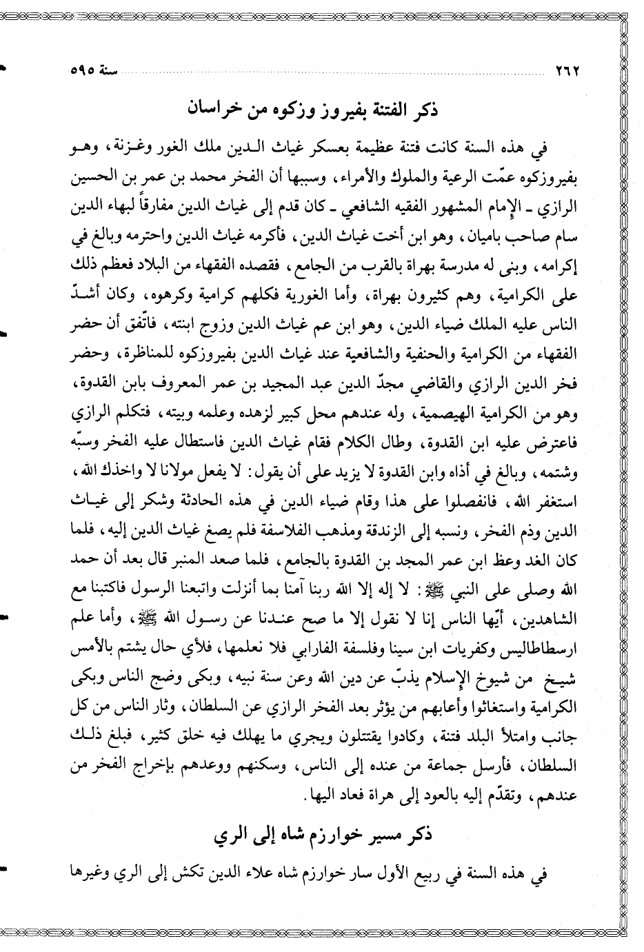 في هذه السنة كانت فتنة عظيمة بعسكر غياث الدين ملك الغور وغزنة وهو بفيروزكوه عمت الرعية والملوك والأمراء وسببها أن الفجر محمد بن عمر بن الحسين الرازي الإمام المشهور الفقيه الشافعي كان قدم إلى غياث الدين مفارقا لبهاء الدين سام صاحب باميان وهو ابن أخت غياث الدين فأكرمه غياث الدين واحترمه وبالغ في إكرامه وبنى له مدرسة بهراة بالقرب من الجامع فقصده الفقهاء من البلاد فعظم ذلك على الكرامية وهو كثيرون بهراة وأما الغورية فكلهم كرامية وكرهوه وكان أشد الناس عليه الملك ضياء الدين وهو ابن عم غياث الدين وزوج ابنته فاتفق أن حضر الفقهاء من الكرامية والحنفية والشافعية عند غياث الدين بفيروزكوه للمناظرة وحضر فخر الدين الرازي والقاضي مجد الدين عبد المجيد بن عمر المعروف بابن القدوة وهو من الكرامية الهيصمية وله عندهم محل كبير لزهده وعلمه وبيته فتكلم الرازي فاعترض عليه ابن القدوة وطال الكلام فقام غياث الدين فاستطال عليه الفخر وسبه وشتمه وبالغ في أذاه وابن القدوة لا يزيد على أن يقول لا يفعل مولانا وأخذك الله استغفر الله فانفصلوا على هذا وقام ضياء الدين في هذه الحادثة وشكر إلى غياث الدين وذم الفخر ونسبه إلى الزندقة ومذهب الفلاسفة فلم يصغ غياث الدين إليه فلما كان الغد وعظ ابن عمر المجد بن القدوة بالجامع فلما صعد المنبر قال بعد أن حمد اللخ وصلى على النبي ى إله إلا الله ربنا آمنا بما أنزلت واتبعنا الرسول فاكتبنا مع الشاهدين أيها الناس إنا لا نقول إلا ما صح عندنا عن رسول الله وأما علم ارسطاطاليس وكفريات ابن سينا وفلسفة الفارابي فلا نعلمها فلأي حال يشتم بالأمس شيخ من شيوخ الإسلام يذب عن دين الله وعن سنة نبيه وبكى وضج الناس وبكى الكرامية واستغاثوا وأعابهم من يؤثر بعد الفخر الرازي عن السلطان وثار الناس من كل جانب وامتلأ البلد فتنة وكادوا يقتتلون ويجري ما يهلك فيه خلق كثير فبلغ ذلك السلطان فأرسل جماعة من عنده إلى الناس وسكنهم ووعدهم بإخراج الفخر من عندهم وتقدم إليه بالعود إلى هراة فعاد اليها