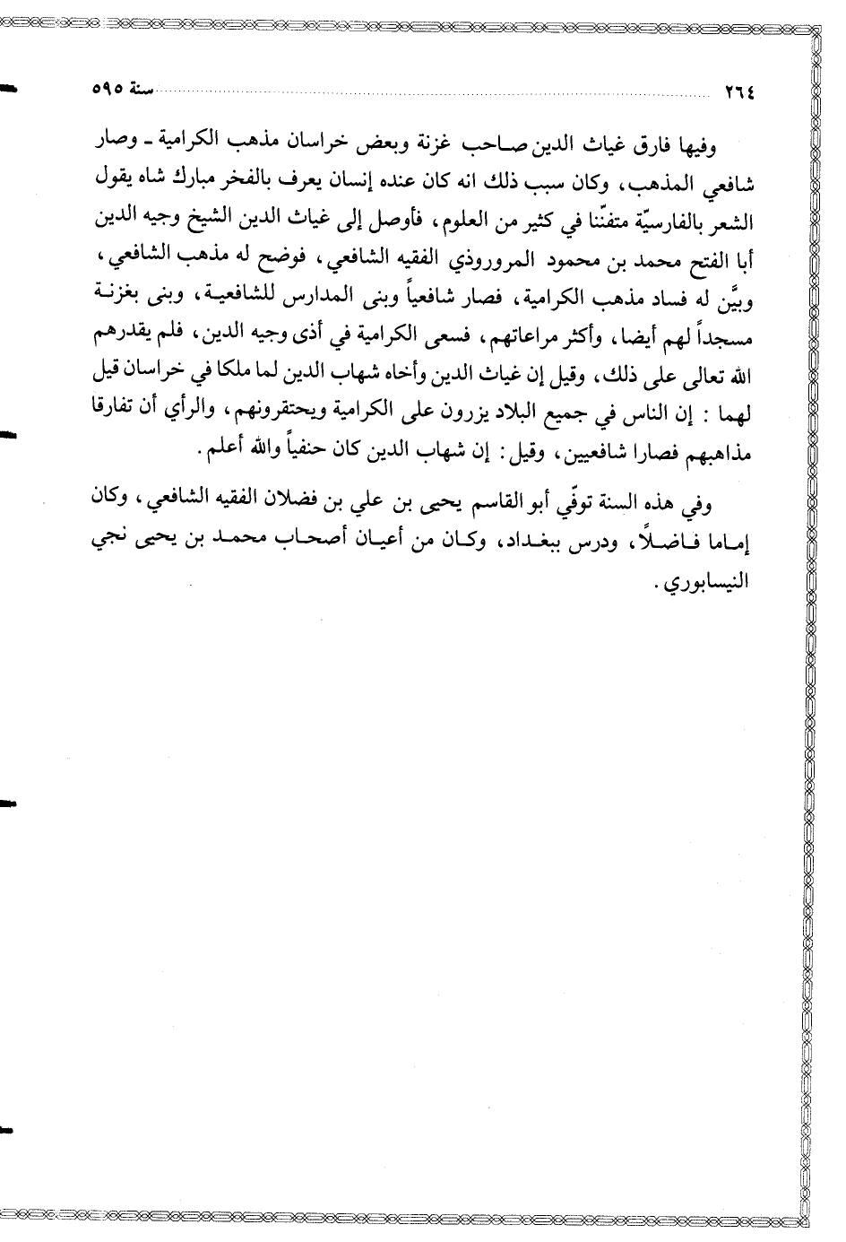 وفيها فارق غياث الدين صاحب غزنة وبعض خراسان مذهب الكرامية وصار شافعي المذهب وكان سبب ذلك انه كان عنده إنسان يعرف بالفخر مبارك شاه يقول الشعر بالفارسية متفننا في كثير من العلوم فأوصل إلى غياث الدين الشيخ وجيه الدين أبا الفتح محمد بن محمود المروروذي الفقيه الشافعي فوضح له مذهب الشافعي وبين له فساد مذهب الكرامية فصار شافعيا وبنى المدارس للشافعية وبنى بغزنة مسجدا لهم أيضا وأكثر مراعاتهم فسعى الكرامية في أذى وجيه الدين فلم يقدرهم الله تعالى على ذلك وقيل إن غياث الدين وأخاه شهاب الدين لما ملكا في خراسان قيل لهما إن الناس في جميع البلاد يزرون على الكرامية ويحتقرونهم والرأي أن تفرقا مذاهبهم فصارا شافعيين وقيل إن شهاب الدين كان حنفيا والله أعلم