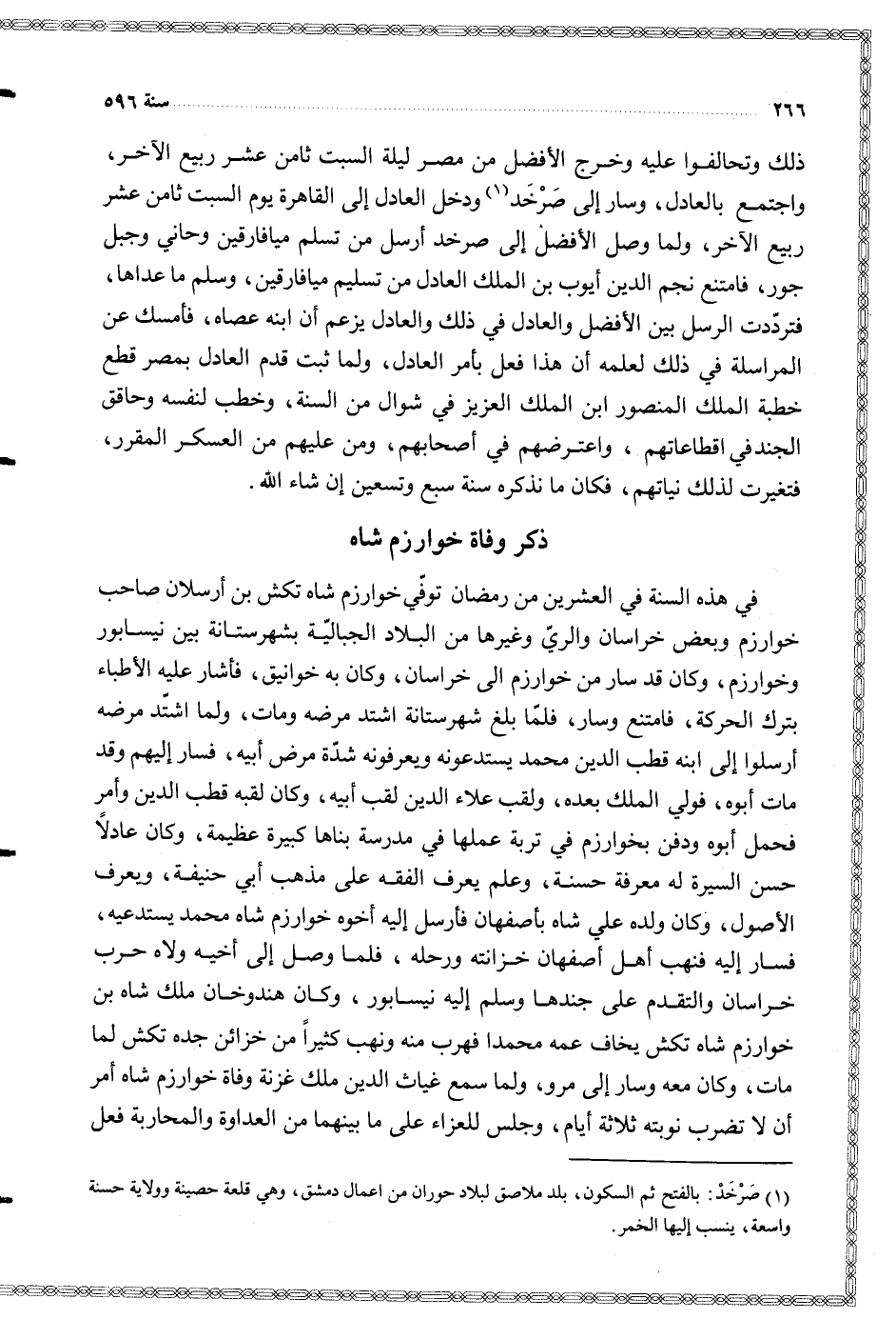 في هذه السنة في العشرين من رمضان توفي خوارزم شاه تكش بن أرسلان صاحب خوارزم وبعض خراسان والري وغيرها من البلاد الجبالية بشهر ستانة بين نيسابور وخوارزم وكان قد سار من خوارزم الى خراسان وكان به خوانيق فأشار عليه الأطباء بترك الحركة فامتنع وسار فلما بلغ شهرستانة اشتد مرضه ومات ولما اشتد مرضه أرسلوا إلى ابنه قطب الدين محمد يستدعونه ويعرفونه شدة مرض أبيه فسار إليهم وقد مات أبوه فولي الملك بعده ولقب علاء الدين لقب أبيه وكان لقبه قطب الدين وأمر فحمل أبوه ودفن بخوارزم في تربة عملها في مدرسة بناها كبيرة عظيمة وكان عادلا حسن السيرة له معرفة حسنة وعلم يعرف الفقه على مذهب أبي حنيفة ويعرف الأصول وكان ولده علي شاه بأصفهان فأرسل إليه أخوه خوارزم شاه محمد يستدعيه فسار إليه فنهب أهل أصفهان خزانته ورحله فلما وصل إلى أخيه ولاه حرب خراسان والتقدم على جندها وسلم إليه نيسابور وكان هندوخان ملك شاه بن خوارزم شاه تكش يخاف عمه محمدا فهرب منه ونهب كثيرا من خزائن جده تكش لما مات وكان معه وسار إلى مرو ولما سمع غياث الدين ملك غزنة وفاة خوارزم شاه أمر أن لا تضرب نوبته ثلاثة أيام وجلس للعزاء على ما بينهما من العداوة والمحاربة فعل