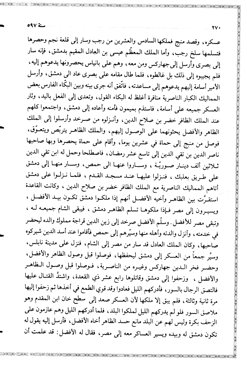 وسلم الأفضل صرخد إلى زين الدين قراجة مملوك والده ليحضر في خدمته وأنزل والدته وأهله منها وسيرهم إلى حمص فأقاموا عند أسد الدين شيركوه صاحبها وكان الملك العادل قد سار من مصر إلى الشام فنزل على مدينة نابلس وسير جمعا من العسكر إلى دمشق ليحفظها فوصلوا قبل وصول الظاهر والأفضل وحضر فخر الدين جهاركس وغيره من الناصرية فوصلوا قبل وصول الظاهر والأفضل وزحفوا إلى دمشق وقاتلوها رابع عشر ذي القعدة واشتد القتال عليها فالتصق الرجال بالسور فأدركهم الليل فعادوا وقد قوي الطمع في أخذها ثم زحفوا إليها مرة ثانية وثالثة فلم يبق إلا ملكها لأن العسكر صعد إلى سطح خان ابن المقدم وهو ملاصق السور فلو لم يدركهم الليل لملكوا البلد فلما أدركهم الليل وهم عازمون على الزوحف بكرة وليس لهم عن البلد مانع حسد الظاهر أخاه الأفضل فأرسل إليه يقول له تكون دمشق له وبيده ويسير العساكر معه إلى مصر فقال له الأفضل قد علمت أن