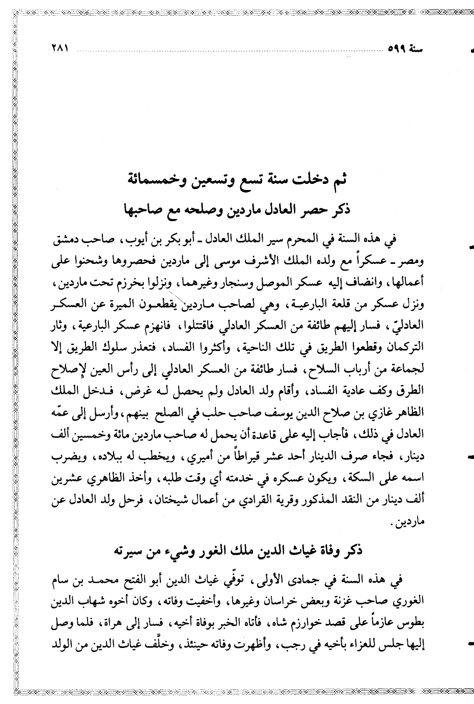 في هذه السنة في المحرم سير الملك العادل أبو بكر بن أيوب صاحب دمشق ومصر عسكرا مع ولده الملك الأشرف موسى إلى ماردين فحصروها وشحنوا على أعمالها وانضاف إليه عسكر الموصل وسنجار وغيرهما ونزلوا بخرزم تحت ماردين ونزل عسكر من قلعة البارعية وهي لصاحب ماردين يقطعون الميرة عن العسكر العادلي فسار إليهم طائفة من العسكر العادلي فاقتتلوا فانهزم عسكر البارعية وثار التركمان وقطعوا الطريق في تلك الناحية وأكثروا الفساد فتعذر سلوك الطريق إلا لجماعة من أرباب السلاح فسار طائفة من العسكر العادلي إلى رأس العين لإصلاح الطريق وكف عادية الفساد وأقام ولد العادل ولم يحصل له غرض فدخل الملك الظاهر غازي بن صلاح الدين يوسف صاحب حلب في الصلح بينهم وأرسل إلى عمه العادل في ذلك فأجاب إليه على قاعدة أن يحمل له صاحب ماردين مائة وخمسين ألف دينار فجاء صرف الدينار أحد عشر قيراطا من أميري ويخطب له ببلاده ويضرب اسمه على السكة ويكون عسكره في خدمته أي وقت طلبه وأخذ الظاهري عشرين ألف دينار من النقد المذكور وقرية القرادي من أعمال شيختان فرحل ولد العادل عن ماردين