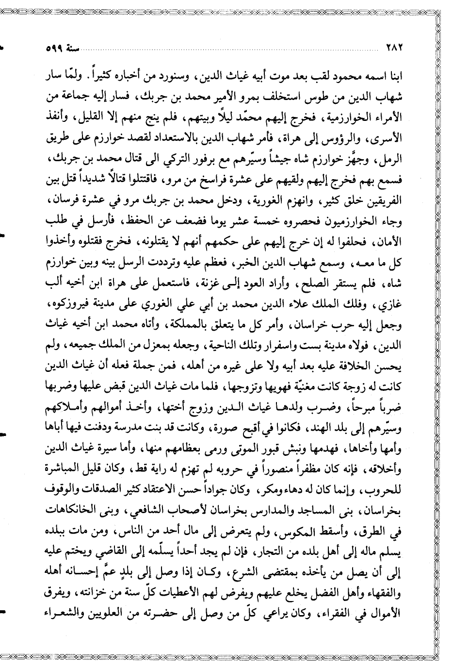 ولما سار شهاب الدين من طوس استخلف بمرو الأمير محمد بن جربك فسار إليه جماعة من الأمراء الخوارزمية فخرج إليهم محمد ليلا وبيتهم فلم ينج منهم إلا القليل وأنفذ الأسرى والرؤوس إلى هراة فأمر شهاب الدين بالاستعداد لقصد خوارزم على طريق الرمل وجهز خوارزم شاه جيشا وسيرهم مع برفور التركي الى قتال محمد بن جربك فسمع بهم فخرج إليهم ولقيهم على عشرة فراسخ من مرو فاقتتلوا قتالا شديدا قتل بين الفريقين خلق كثير وانهزم الغورية ودخل محمد بن جربك مرو في عشرة فرسان وجاء الخوارزميون فحصروه خمسة عشر يوما فضعف عن الحفظ فأرسل في طلب الأمان فحلفوا له إن خرج إليهم على حكمهم أنهم لا يقتلونه فخرج فقتلوه وأخذوا كل ما معه وسمع شهاب الدين الخبر فعظم عليه وترددت الرسل بينه وبين خوارزم شاه فلم يستقر الصلح وأراد العود إلى غزنة فاستعمل على هراة ابن أخيه ألب غازي وفلك الملك علاء الدين محمد بن أبي علي الغوري على مدينة فيروزكوه وجعل إليه حرب خراسان وأمر كل ما يتعلق بالمملكة وأتاه محمد ابن أخيه غياث الدين فولاه مدينة بست واسفرار وتلك الناحية وجعله بمعزل من الملك جميعه ولم يحسن الخلافة عليه بعد أبيه ولا على غيره من أهله فمن جملة فعله أن غياث الدين كانت له زوجة كانت مغنية فهويها وتزوجها فلما مات غياث الدين قبض عليها وضربها ضربا مبرحا وضرب ولدها غياث الدين وزوج أختها وأخذ أموالهم وأملاكهم وسيرهم ألى بلد الهند فكانوا في أقبح صورة وكانت قد بنت مدرسة ودفنت فيها أباها وأمها وأخاها فهدمها ونبش قبور الموتى ورمى بعظامهم منها وأما سيرة غياث الدين وأخلاقه فإنه كان مظفرا منصورا في حروبه لم تهزم له راية قط وكان قليل المباشرة للحروب وإنما كان له دهاء ومكر وكان جوادا حسن الاعتقاد كثير الصدقات والوقوف بخراسان بنى المساجد والمدارس بخراسان لأصحاب الشافعي وبنى الخانكاهات في الطرق وأسقط المكوس ولم يتعرض إلى أحد من الناس ومن مات ببلده يسلم ماله إلى أهل بلده من التجار فإن لم يجد أحدا يسلمه إلى القاضي ويختم عليه إلى أن يصل من يأخذه بمقتضى الشرع وكان إذا وصل إلى بلد عم إحسانه أهله والفقهاء وأهل الفضل يخلع عليهم ويفرض لهم الأعطيات كل سنة من خزانته ويفرق الأموال في الفقراء وكان يراعي كل من وصل إلى حضرته من العلويين والشعراء