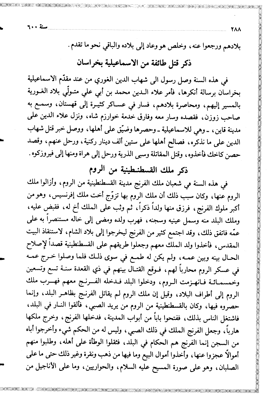 في هذه السنة في شعبان ملك الفرنج مدينة القسطنطينية من الروم وأزالوا ملك الرزم عنها وكان سبب ذلك أن ملك الروم بها تزوج أخت ملك إفرنسيس وهو من أكبر ملوك الفرنج فرزق منها ولدا ذكرا ثم وثب على الملك أخ له فقبض عليه وملك البلد منه وسمل عينيه وسجنه فهرب ولده ومضى إلى خاله مستنصرا به على عمه فاتفق ذلك وقد اجتمع كثير من الفرنج ليخرجوا إلى بلاد الشام لاستنقاذ البيت المقدس فأخذوا ولد الملك معهم وجعلوا طريقهم على القسطنطينية قصدا لإصلاح الحال بينه وبين عمه ولم يكن له طمع في سوى ذلك فلما وصلوا خرج عمه في عسكر الروم محاربا لهم فوقع القتال بينهم في ذي القعدة سنة تسع وتسعين وخمسمائة فانهزمت الروم ودخلوا البلد فدخله الفرنج معهم فهرب ملك الروم إلى أطراف البلاد وقيل إن ملك الروم لم يقاتل الفرنج بظاهر البلد وإنما حصروه فيها وكان بالقسطنطينية من الروم من يريد الصبي فألقوا النار في البلد فاشتغل الناس بذلك ففتحوا بابا من أبواب المدينة فدخلها الفرنج وخرج ملكها هاربا وجعل الفرنج الملك في ذلك الصبي وليس له من الحكم شيء وأخرجوا أباه من السجن إنما الفرنج هم الحكام في البلد فثقلوا الوطأة على أهله وطلبوا منهم أموالا عجزوا عنها وأخذوا أموال البيع وما فيها من ذهب ونقرة وغير ذلك حتى ما على الصلبان وهو على صورة المسيح عليه السلام والحواريين وما على الأناجيل من