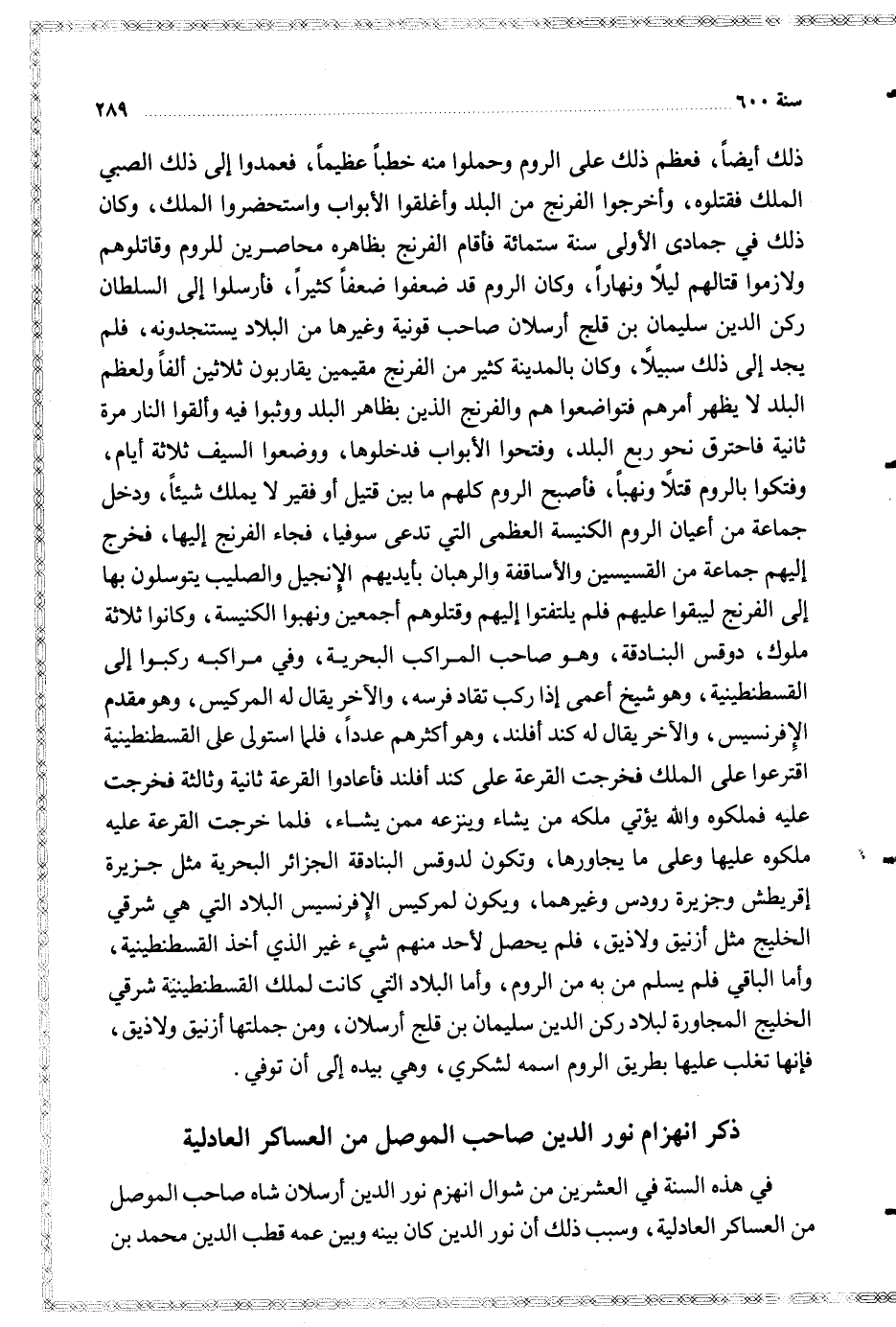 ذلك أيضا فعظم ذلك على الروم وحملوا منه خطبا عظيما فعمدوا إلى ذلك الصبي الملك فقتلوه وأخرجوا الفرنج من البلد وأغلقوا الأبواب واستحضروا ذلك وكان ذلك في جمادى الأولى سنة ستمائة فأقام الفرنج بظاهره محاصرين للروم وقاتلوهم ولازموا قتالهم ليلا ونهارا وكان الروم قد ضعفوا ضعفا كثيرا فأرسلوا إلى السلطان ركن الدين سليمان بن قلج أرسلان صاحب قونية وغيرها من البلاد يستنجدونه فلم يجد إلى ذلك سبيلا وكان بالمدينة كثير من الفرنج مقيمين يقاربون ثلاثين ألفا ولعظم البلد لا يظهر أمرهم فتواضعوا هم والفرنج الذين بظاهر البلد ووثبوا فيه وألقوا النار مرة ثانية فاحترق نحو ربع البلد وفتحوا الأبواب فدخلوها ووضعوا السيف ثلاثة أيام وفتكوا بالروم قتلا ونهبا فأصبح الروم كلهم ما بين قتيل أو فقير لا يملك شيئا ودخل جماعة من أعيان الروم الكنيسة العظمى التي تدعى سوفيا فجاء الفرنج إليها فخرج إليهم جماعة من القسيسين والأساقفة والرهبان بأيديهم الإنجيل والصليب يتوسلون بها إلى الفرنج ليبقوا عليهم فلم يلتفتوا إليهم وقتلوهم أجمعين ونهبوا الكنيسة وكانوا ثلاثة مملوك ودوقس البنادقة وهو صاحب المراكب البحرية وفي مراكبه ركبوا إلى القسطنطينية وهو شيخ أعمى إذا ركب تقاد فرسه والآخر يقال له المركيس وهو مقدم الإفرنسيس والآخر يقال له كند أفلند وهو أكثرهم عددا فلما استولى على القسطنطينية اقترعوا على الملك فخرجت القرعة على كند أفلند فأعادوا القرعة ثانية وثالثة فخرجت عليه فملكوه والله يؤتي ملكه من يشاء وينزعه ممن يشاء فلما خرجت القرعة عليه ملكوه عليها وعلى ما يجاورها وتكون لدوقس البنادقة الجزائر البحرية مثل جزيرة إقريطش وجزيرة رودس وغيرهما ويكون لمركيس الإفرنسيس البلاد التي هي شرقي الخليج مثل أزنيق ولاذيق فلم يحصل لأحد منهم شيء غير الذي أخذ القسطنطينية وأما الباقي فلم يسلم من به من الروم وأما البلاد التي كانت لملك القسطنطينية شرقي الخليج المجاورة لبلاد ركن الدين سليمان بن قلج أرسلان ومن جملتها أزنيق ولاذيق فإنها تغلب عليها بطريق الروم اسمه لشكري وهي بيده إلى أن توفي
