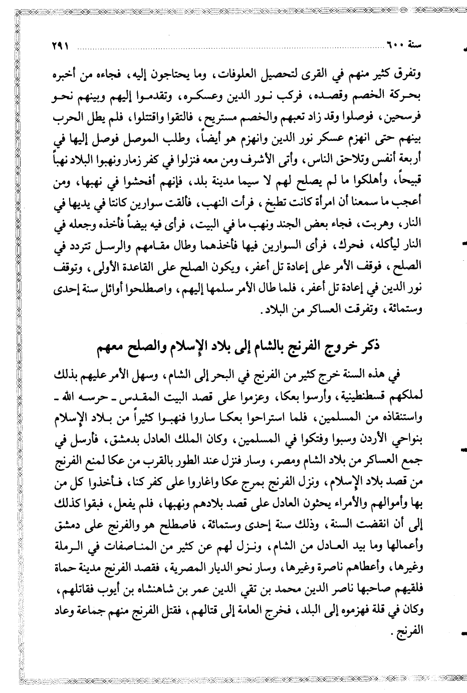 في هذه السنة خرج كثير من الفرنج في البحر إلى الشام وسهل الأمر عليهم بذلك لملكهم قسطنطينية وأرسوا بعكا وعزموا على قصد البيت المقدس حرسه الله واستنقاذه من المسلمين فلما استراحوا بعكا ساروا فنهبوا كثيرا من بلاد الإسلام بنواحي الأردن وسبوا وفتكوا في المسلمين وكان الملك العادل بدمشق فأرسل في جمع العساكر من بلاد الشام ومصر وسار فنزل عند الطور بالقرب من عكا لمنع الفرنج من قصد بلاد الإسلام ونزل الفرنج بمرج عكا واغاروا على كفر كنا فأخذوا كل من بها وأموالهم والأمراء يحثون العادل على قصد بلادهم ونهبها فلم يفعل فبقوا كذلك إلى أن انقضت السنة وذلك سنة إحدى وستمائة فاصطلح هو والفرنج على دمشق وأعمالها وما بيد العادل من الشام ونزل لهم عن كثير من المناصفات في الرملة وغيرها وأعطاهم ناصرة وغيرها وسار نحو الديار المصرية فقصد الفرنج مدينة حماة فلقيهم صاحبها ناصر الدين محمد بن تقي الدين عمر بن شاهنشاه بن أيوب فقاتلهم وكان في قلة فهزموه إلى البلد فخرج العامة إلى قتالهم فقتل الفرنج منهم جماعة وعاد الفرنج