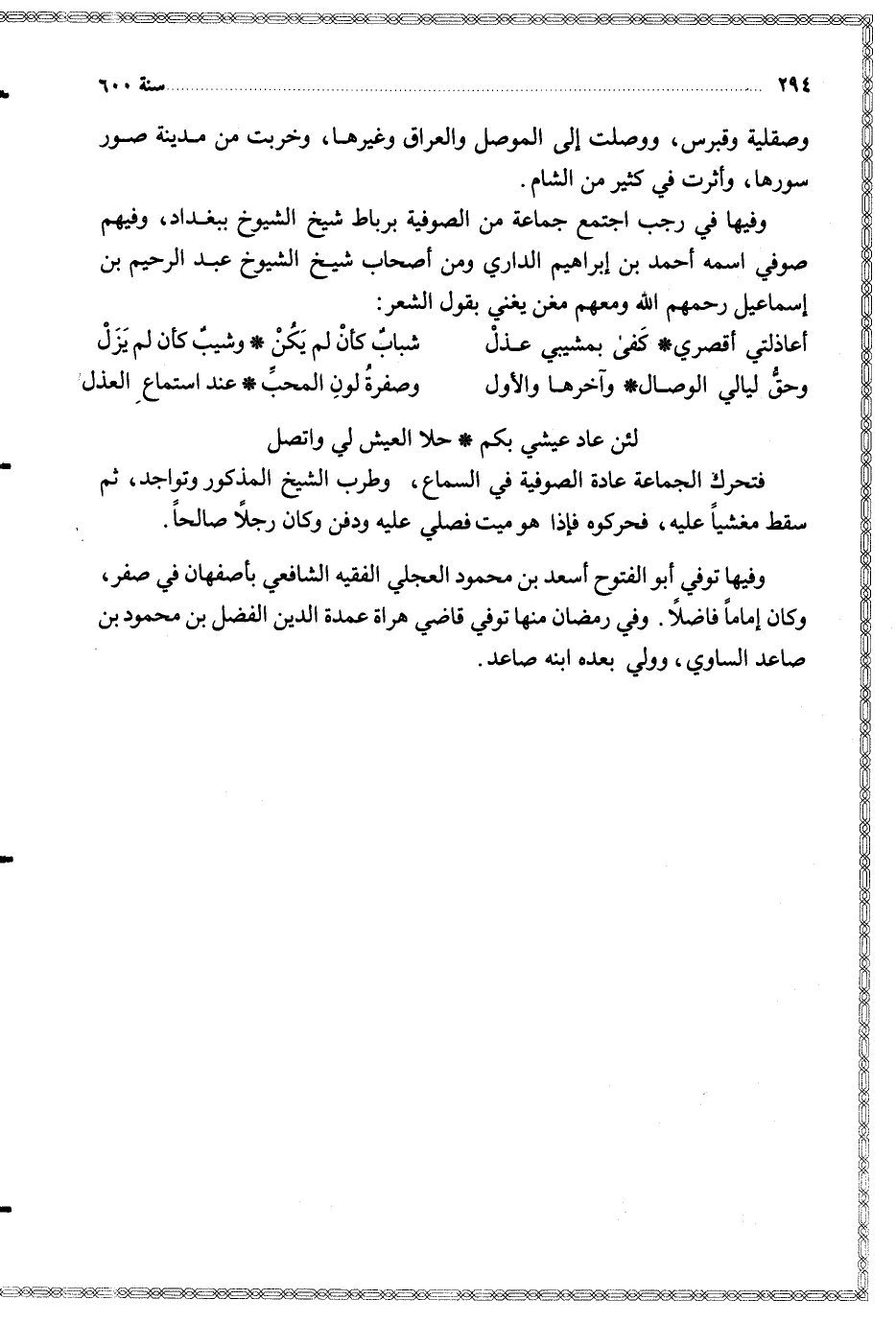 وفيها في رجب اجتمع جماعة من الصوفية برباط شيخ الشيوخ ببغداد وفيهم صوفي اسمه أحمد بن إبراهيم الداري ومن أصحاب شيخ الشيوخ عبد الرحيم بن إسماعيل رحمهم الله ومعهم مغن يغنى بقول الشعر