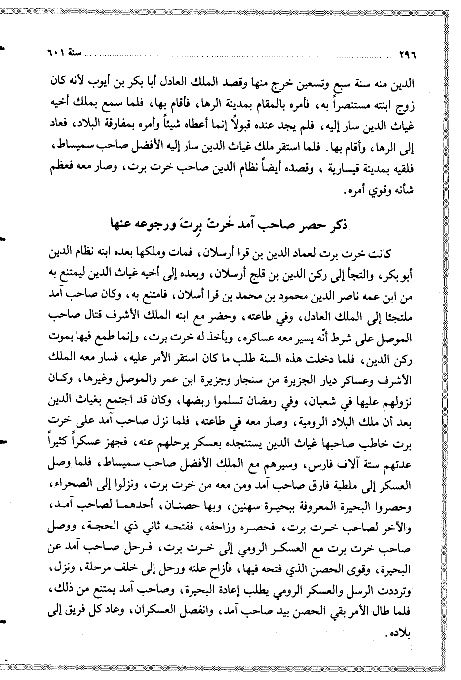 كانت خرت برت لعماد الدين بن قرا أرسلان فمات وملكها بعده ابنه نظام الدين أبو بكر والتجأ إلى ركن الدين بن قلج أرسلان وبعده إلى أخيه غياث الدين ليمتنع به من ابن عمه ناصر الدين محمود بن محمد بن قرا أرسلان فامتنع به وكان صاحب آمد ملتجئا إلى الملك العادل وفي طاعته وحضر مع ابنه الملك الأشرف قتال صاحب الموصل على شرط أنه يسير معه عساكره ويأخذ له خرت برت وإنما طمع فيها بموت ركن الدين فلما دخلت هذه السنة طلب ما كان استقر الأمر عليه فسار معه الملك الأشرف وعساكر ديار الجزيرة من سنجار وجزيرة ابن عمر والموصل وغيرها وكان نزولهم عليها في شعبان وفي رمضان تسلموا ربضها وكان قد اجتمع بغياث الدين بعد أن ملك البلاد الرومية وصار معه في طاعته فلما نزل صاحب آمد على خرت برت خاطب صاحبها غياث الدين يستنجده بعسكر يرحلهم عنه فجهز عسكرا كثيرا عدتهم ستة آلاف فارس وسيرهم مع الملك الأفضل صاحب سميساط فلما وصل العسكر إلى ملطية فارق صاحب آمد ومن معه من خرت برت ونزلوا إلى الصحراء وحصروا البحيرة المعروفة ببحيرة سهنين وبها حصنان أحدهما لصاحب آمد والآخر لصاحب خرت برت فحصره وزاحفه ففتحه ثاني ذي الحجة ووصل صاحب خرت برت مع العسكر الرومي إلى خرت برت فرحل صاحب آمد عن البحيرة وقوى الحصن الذي فتحه فيها فأزاح علته ورحل إلى خلف مرحلة ونزل وترددت الرسل والعسكر الرومي يطلب إعادة البحيرة وصاحب آمد يمتنع من ذلك فلما طال الأمر بقي الحصن بيد صاحب آمد وانفصل العسكران وعاد كل فريق إلى بلاده