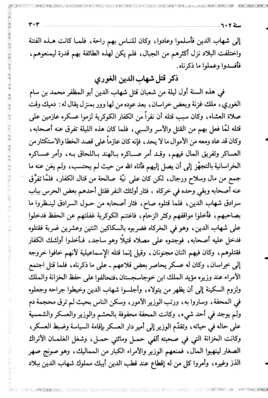 في هذه السنة أول ليلة من شعبان قتل شهاب الدين أبو المظفر محمد بن سام الغوري ملك غزنة وبعض خراسان بعد عوده من لها وور بمنزل يقال له دميك وقت صلاة العشاء وكان سبب قتله أن نفرا من الكفار الكوكرية لزموا عسكره عازمين على قتله لما فعل بهم من القتل والأسر والسبي فلما كان هذه الليلة تفرق عنه أصحابه وكان قد عاد ومعه من الأموال ما لا يحد فإنه كان عازما على قصد الخطا والاستكثار من العساكر وتفريق المال فيهم وقد أمر عساكره بالهند باللحاق به وأمر عساكره الخراسانية بالتجهز إلى أن يصل إليهم فأتاه الله من حيث لم يحتسب ولم يغن عنه ما جمع من مال وسلاح ورجال لكن كان على نية صالحة من قتال الكفار فلما تفرق عنه أصحابه وبقي وحده في خركاه فثار أولئك النفر فقتل أحدهم بعض الحرس بباب سرادق شهاب الدين فلما قتلوه صاح فثار أصحابه من حول السرادق لينظروا ما بصاحبهم فأخلوا مواقفهم وكثر الزحام فاغتنم الكوكرية غفلتهم عن الحفظ فدخلوا على شهاب الدين وهو في الخركاه فضربوه بالسكاكين اثنتين وعشرين ضربة فقتلوه فدخل عليه أصحابه فوجدوه على مصلاه قتيلا وهو ساجد فأخذوا أولئك الكفار فقتلوهم وكان فيهم اثنان مجنونان وقيل إنما قتله الإسماعيلية لأنهم خافوا خروجه إلى خراسان وكان له عسكر يحاصر بعض قلاعهم على ما ذكرناه فلما قتل اجتمع الأمراء عند وزيره مؤيد الملك ابن خوجا سجستان فتحالفوا على حفظ الخزانة والملك ولزوم السكينة إلى أن يظهر من يتولاه وأجلسوا شهاب الدين وخيطوا جراحه وجعلوه في المحفة وساروا به ورتب الوزير الأمور وسكن الناس بحيث لم ترق محجمة دم ولم يوجد في أحد شيء وكانت المحفة محفوفة بالحشم والوزير والعسكر والشمسية على حاله في حياته وتقدم الوزير إلى أمير دار العسكر بإقامة السياسة وضبط العسكر وكانت الخزانة التي في صحبته ألفي حمل ومائتي حمل وشغل الغلمان الأتراك الصغار لينهبوا المال فمنعهم الوزير والأمراء الكبار من المماليك وهو صونج صهر الذز وغيره وأمروا كل من له إقطاع عند قطب الدين أيبك مملوك شهاب الدين ببلاد