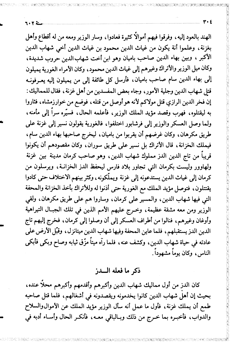 الهند بالعود إليه وفرقوا فيهم أموالا كثيرة فعادوا وسار الوزير ومعه من له أقطاع وأهل بغزنة وعلموا أنه يكون من غياث الدين محمود بن غياث الدين أخي شهاب الدين الأكبر وبين بهاء الدين صاحب باميان وهو ابن أخت شهاب الدين حروب شديدة وكان ميل الوزير والأتراك وغيرهم إلى غياث الدين محمود وكان الأمراء الغورية يميلون إلى بهاء الدين سام صاحب باميان فأرسل كل طائفة إلى من يميلون إليه يعرفونه قتل شهاب الدين وجلية الأمور وجاء بعض المفسدين من أهل غزنة فقال للمماليك إن فخر الدين الرازي قتل مولاكم لأنه هو أوصل من قتله فوضع من خوارزمشاه فثاروا به ليقتلوه فهرب وقصد مؤيد الملك الوزير فأعلمه الحال فسيره سرا إلى مأمنه ولما وصل العسكر والوزير إلى فرشابور اختلفوا فالغورية يقولون نسير إلى غزنة على طريق مكرهان وكان غرضهم أن يقربوا من باميان ليخرج صاحبها بهاء الدين سام فيملك الخزانة قال الأتراك بل نسير على طريق سوران وكان مقصودهم أن يكونوا قريبا من تاج الدين الدز مملوك شهاب الدين وهو صاحب كرمان مدينة بين غزنة ولهاوور وليست بكرمان التي تجاور بلاد فارس ليحفظ الدز الخزانة ويرسلون من كرمان إلى غياث الدين يستدعونه إلى غزنة ويملكونه وكثر بينهم الاختلاف حتى كادوا يقتتلون فتوصل مؤيد الملك مع الغورية حتى أذنوا له وللأتراك بأخذ الخزانة والمحفة التي فيها شهاب الدين والمسير على كرمان وساروا هم على طريق مكرهان ولقي الوزير ومن معه مشقة عظيمة وخرج عليهم الأمم الذين في تلك الجبال التيراهية وأوغان وغيرهم فنالوا من أطراف العسكر إلى أن وصلوا إلى كرمان فخرج إليهم تاج الدين الدز يستقبلهم فلما عاين المحفة وفيها شهاب الدين ميتانزل وقبل الأرض على عادته في حياة شهاب الدين وكشف عنه فلما رآه ميتا مزق ثيابه وصاح وبكى فأبكى الناس وكان يوما مشهودا