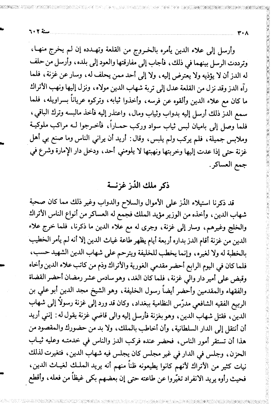 وأرسل إلى علاء الدين يأمره بالخروج من القلعة وتهدده إن لم يخرج منها وترددت الرسل بينهما في ذلك فأجاب إلى مفارقتها والعود إلى بلده وأرسل من حلف له الدز أن لا يؤذيه ولا يعترض إليه ولا إلى أحد ممن يحلف له وسار عن غزنة فلما رأه الدز وقد نزل من القلعة عدل إلى تربة شهاب الدين مولاه ونزل إليها ونهب الأتراك ما كان مع علاء الدين وألقوه عن فرسه وأخذوا ثيابه وتركوه عريانا بسراويله فلما سمع الدز ذلك أرسل إليه بدواب وثياب ومال واعتذر إليه فأخذ ما لبسه وترك الباقي فلما وصل إلى باميان لبس ثياب سواد وركب حمارا فأخرجوا له مراكب ملوكية وملابس جميلة فلم يركب ولم يلبس وقال أريد أن يراني الناس وما صنع بي أهل غزنة حتى إذا عدت إليها وخربتها ونهبتها لا يلومني أحد ودخل دار الإمارة وشرع في جمع العساكر