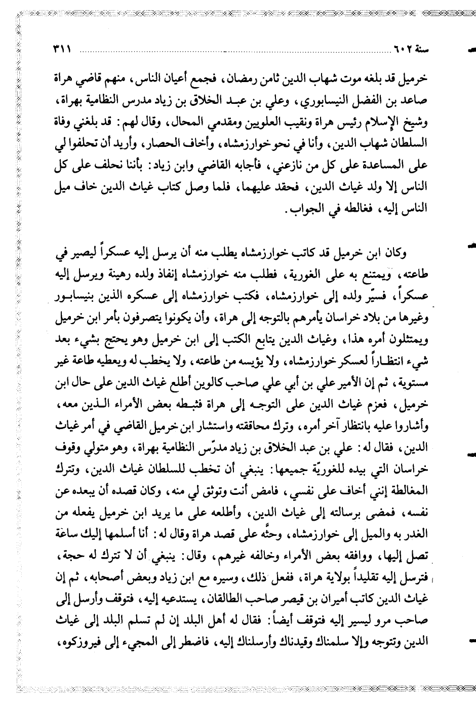 خرميل قد بلغه موت شهاب الدين ثامن رمضان فجمع أعيان الناس منهم قاضي هراة صاعد بن الفضل النيسابوري وعلي بن عبد الخلاق بن زياد مدرس النظامية بهراة وشيخ الإسلام رئيس هراة ونقيب العلويين ومقدمي المحال وقال لهم قد بلغني وفاة السلطان شهاب الدين وأنا في نحو خوارزمشاه وأخاف الحصار وأريد أن تحلفوا لي على المساعدة على كل من نازعني فأجابه القاضي وابن زياد بأننا نحلف على كل الناس إلا ولد غياث الدين فحقد عليهما فلما وصل كتاب غياث الدين خاف ميل الناس إليه فغالطه في الجواب