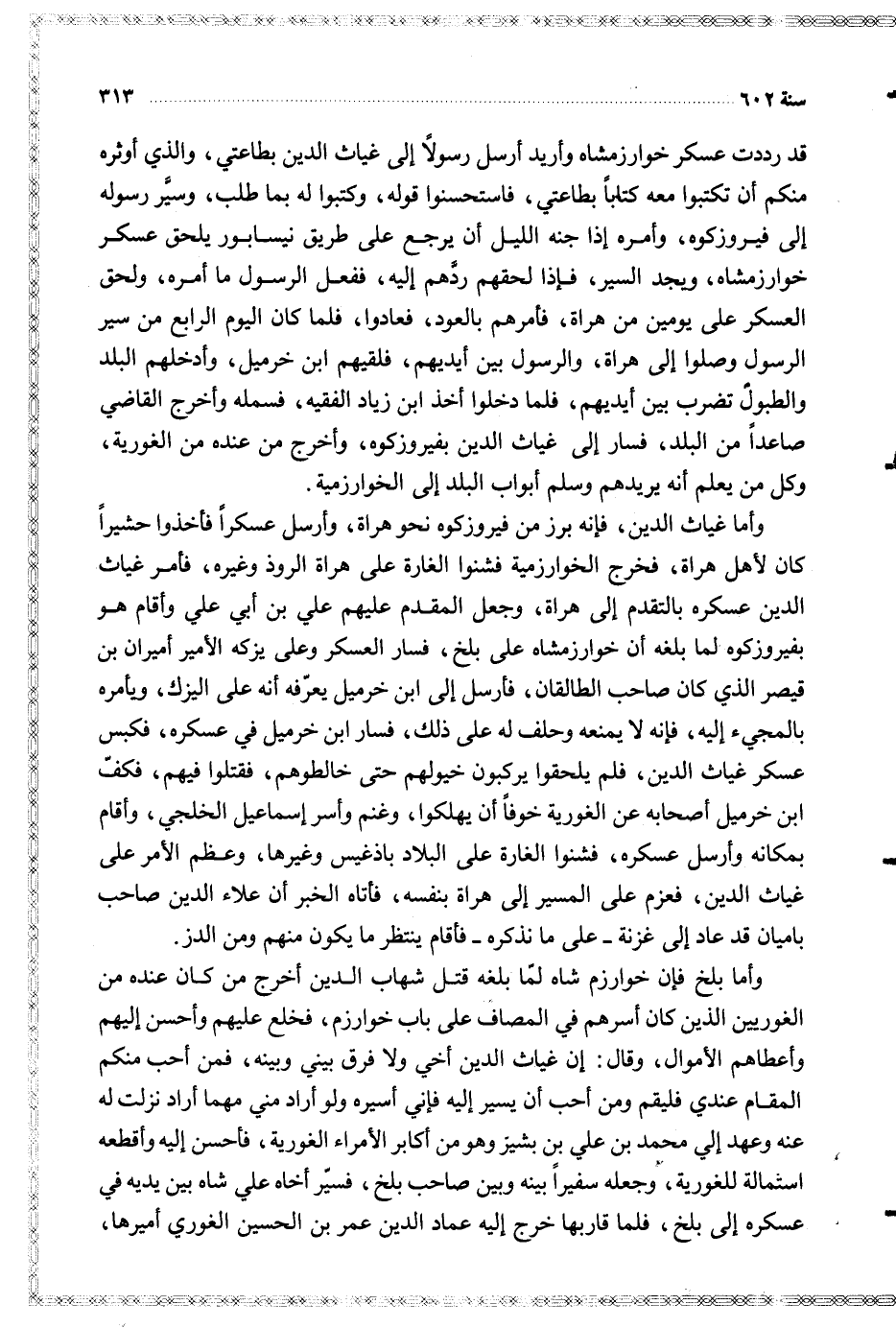 قد رددت عسكر خوارزمشاه وأريد أرسل رسولا إلى غياث الدين بطاعتي والذي أوثره منكم أن تكتبوا معه كتابا بطاعتي فاستحسنوا قوله وكتبوا له بما طلب وسير رسوله إلى فيروزكوه وأمره إذا جنه الليل أن يرجع على طريق نيسابور يلحق عسكر خوارزمشاه ويجد السير فإذا لحقهم ردهم إليه ففعل الرسول ما أمره ولحق العسكر على يومين من هراة فأمرهم بالعود فعادوا فلما كان اليوم الرابع من سير الرسول وصلوا إلى هراة والرسول بين أيديهم فلقيهم ابن خرميل وأدخلهم البلد والطبول تضرب بين أيديهم فلما دخلوا أخذ ابن زياد الفقيه فسمله وأخرج القاضي صاعدا من البلد فسار إلى غياث الدين بفيروزكوه وأخرج من عنده من الغورية وكل من يعلم أنه يريدهم وسلم أبواب البلد إلى الخوارزمية