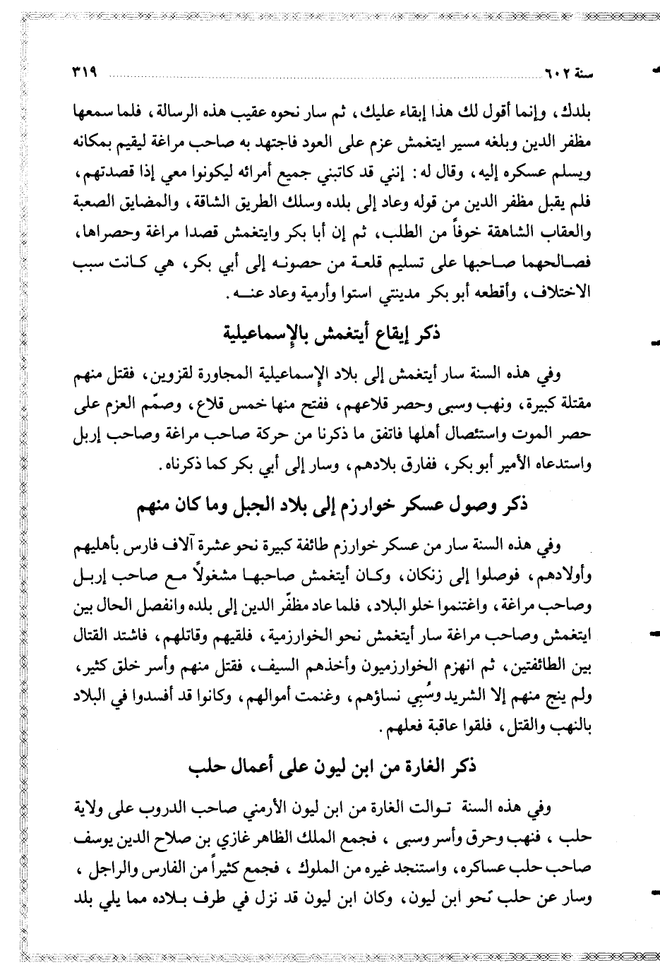 وفي هذه السنة أيتغمش إلى بلاد الإسماعيلية المجاورة لقزوين فقتل منهم مقتلة كبيرة ونهب وسبي وحصر قلاعهم ففتح منها خمس قلاع وصمم العزم على حصر الموت واستئصال أهلها فاتفق ما ذكرنا من حركة صاحب مراغة وصاحب إربل واستدعاه الأمير أبو بكر ففارق بلادهم وسار إلى أبي بكر كما ذكرناه