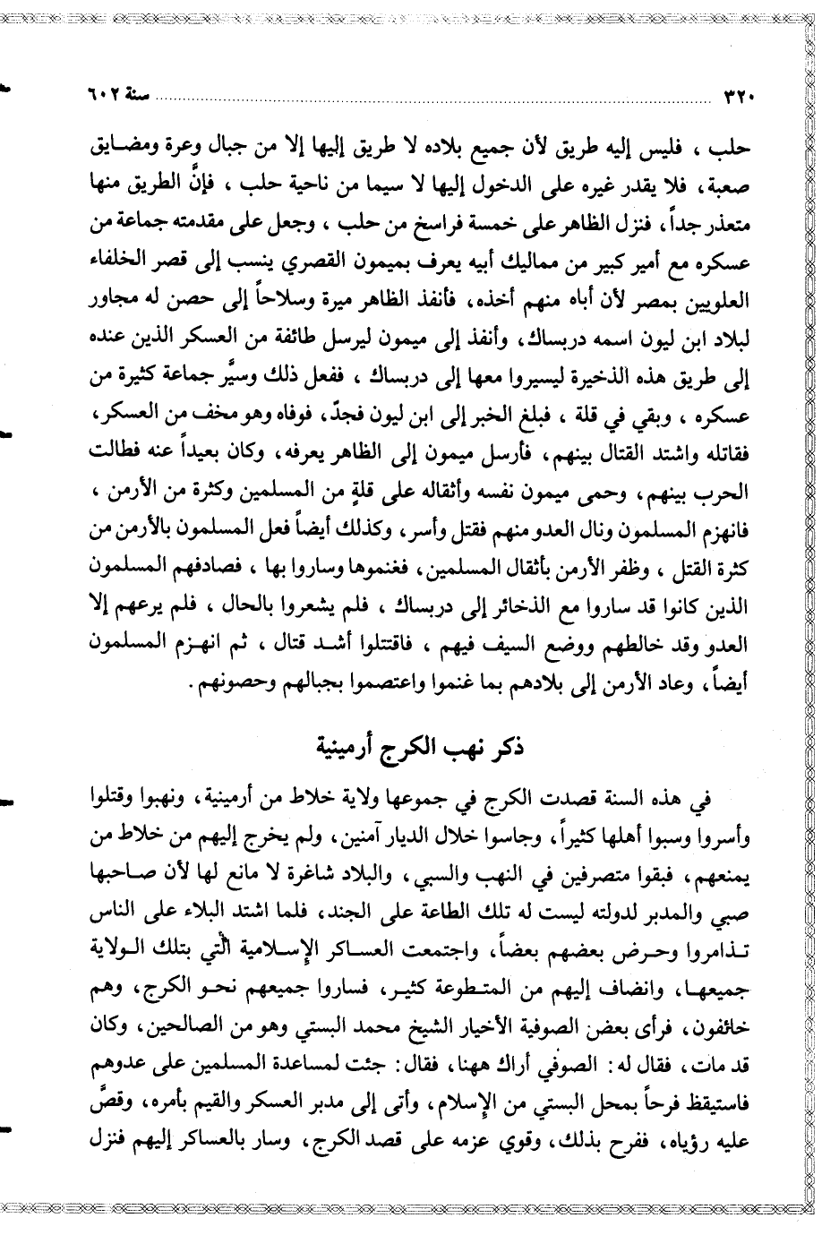 حلب فليس إليه طريق لأن جميع بلاده لا طريق إليها إلا من جبال وعرة ومضايق صعبة فلا يقدر غيره على الدخول إليها لا سيما من ناحيى حلب فإن الطريق منها متعذر جدا فنزل الظاهر على خمسة فراسخ من حلب وجعل على مقدمته جماعة من عسكره مع أمير كبير من مماليك أبيه يعرف بميمون القصري ينسب إلى قصر الخلفاء العلويين بمصر لأن أباه منهم أخذه فأنفذ الظاهر ميرة وسلاحا إلى حصن له مجاور لبلاد ابن ليون اسمه دربساك وأنفذ إلى ميمون ليرسل طائفة من العسكر الذي عنده إلى طريق هذه الذخيرة ليسيروا معها إلى دربساك ففعل ذلك وسير جماعة كثيرة من عسكره وبقي في قلة فبلغ الخبر إلى ابن ليون فجد فوفاه وهو مخف من العسكر فقاتله واشتد القتال بينهم فأرسل ميمون إلى الظاهر يعرفه وكان بعيدا عنه فطالت الحرب بينهم وحمى ميمون نفسه وأثقاله على قلة من المسلمين وكثرة من الأرمن فانهزم المسلمون ونال العدو منهم فقتل وأسر وكذلك أيضا فعل المسلمون بالأرمن من كثرة القتل وظفر الأرمن بأثقال المسلمين وساروا بها فصادفهم المسلمون الذين كانوا قد ساروا مع الذخائر إلى دربساك فلم يشعروا بالحال فلم يرعهم إلا العدو وقد خالطهم ووضع السيف فيهم فاقتتلوا أشد قتال ثم انهزم المسلمون أيضا وعاد الأرمن إلى بلادهم بما غنموا واعتصموا بجبالهم وحصونهم