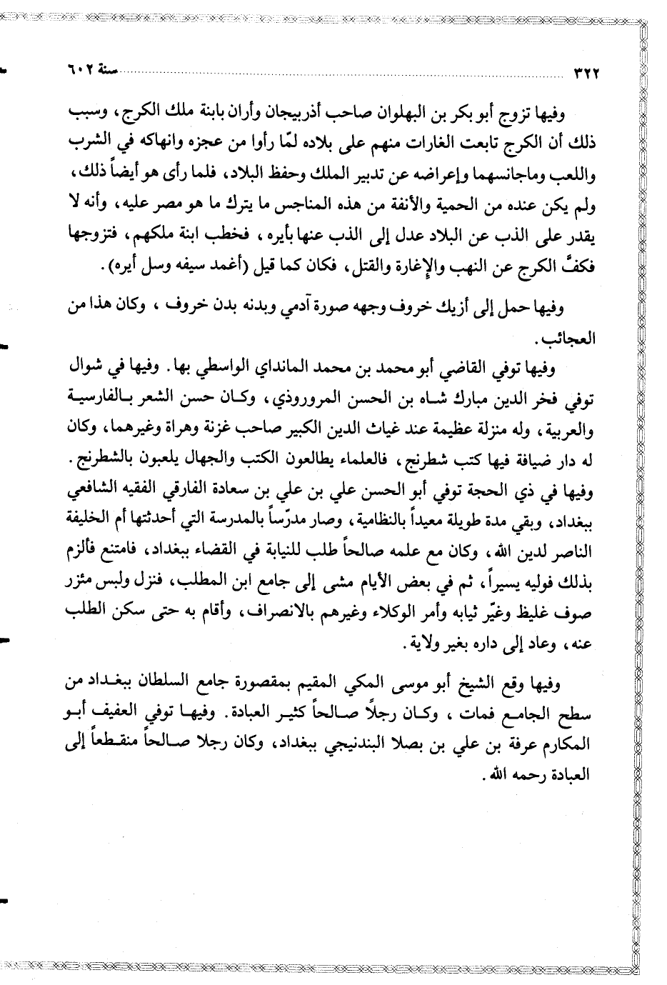 وفيها في ذي الحجة توفي أبو الحسن علي بن علي بن سعادة الفارقي الفقيه الشافعي ببغداد وبقي مدة طويلة معيدا بالنظامية وصار مدرسا بالمدرسة التي أحدثتها أم الخليفة الناصر لدين الله وكان مع علمه صالحا طلب للنيابة في القضاء ببغداد فامتنع فألزم بذلك فوليه يسيرا ثم في بعض الأيام مشى إلى جامع ابن المطلب فنزل ولبس مئزر صوف غليظ وغير ثيابه وأمر الوكلاء وغيرهم بالانصراف وأقام به حتى سكن الطلب عنه وعاد إلى داره بغير ولاية