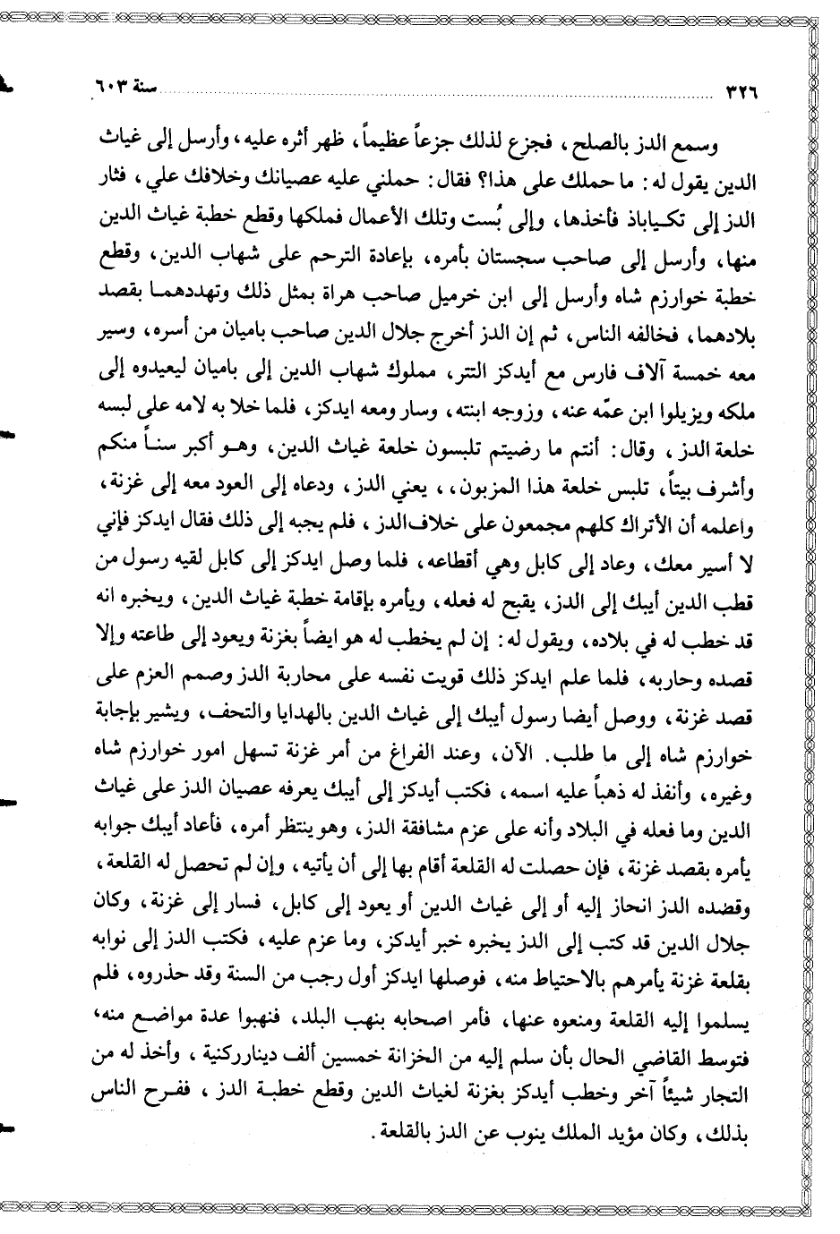 الآن وعند الفراغ من أمر غزنة تسهل امور خوارزم شاه وغيره وأنفذ له ذهبا عليه اسمه فكتب أيدكز إلى أيبك يعرفه عصيان الدز على غياث الدين وما فعله في البلاد وأنه على عزم مشافقة الدز وهو ينتظر أمره فأعاد أيبك جوابه يأمره بقصد غزنة فإن حصلت له القلعة أقام بها إلى أن يأتيه وإن لم تحصل له القلعة وقصده الدز انحاز إليه أو إلى غياث الدين أو يعود إلى كابل فسار إلى غزنة وكان جلال الدين قد كتب إلى الدز يخبره خبر أيدكز وما عزم عليه فكتب الدز إلى نوابه بقلعة غزنة يأمرهم بالاحتياط منه فوصلها ايدكز أول رجب من السنة وقد حذروه فلم يسلموا إليه القلعة ومنعوه عنها فأمر اصحابه بنهب البلد فنهبوا عدة مواضع منه فتوسط القاضي الحال بأن سلم إليه من الخزانة خمسين ألف دينار ركنية وأخذ له من التجار شيئا آخر وخطب أيدكز بغزنة لغياث الدين وقطع خطبة الدز ففرح الناس بذلك وكان مؤيد الملك ينوب عن الدز بالقلعة