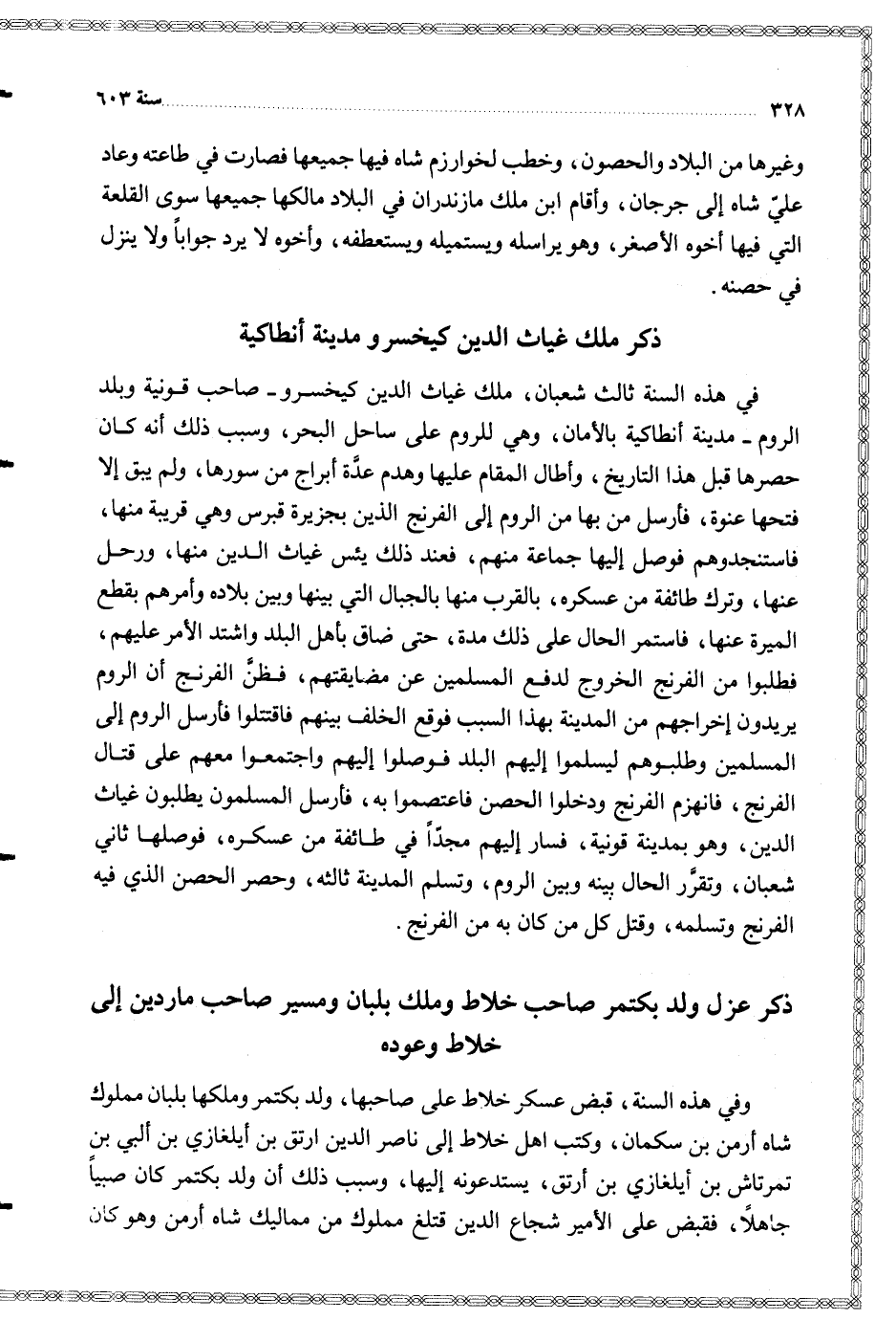 في هذه السنة ثالث شعبان ملك غياث الدين كيخسرو صاحب قونية وبلد الروم مدينة أنطاكية بالأمان وهي للروم على ساحل البحر وسبب ذلك أنه كان حصرها قبل هذا التاريخ وأطال المقام عليها وهدم عدة أبراج من سورها ولم يبق إلا فتحها عنوة فأرسل من بها من الروم إلى الفرنج الذين بجزيرة قبرس وهي قريبة منها فاستنجدوهم فوصل إليها جماعة منهم فعند ذلك يئس غياث الدين منها ورحل عنها وترك طائفة من عسكره بالقرب منها بالجبال التي بينها وبين بلاده وأمرهم بقطع الميرة عنها فاستمر الحال على ذلك مدة حتى ضاق بأهل البلد واشتد الأمر عليهم فطلبوا من الفرنج الخروج لدفع المسلمين عن مضايقتهم فظن الفرنج أن الروم يريدون إخراجهم من المدينة بهذا السبب فوقع الخلف بينهم فاقتتلوا فأرسل الروم إلى المسلمين وطلبوهم ليسلموا إليهم البلد فوصلوا إليهم واجتمعوا معهم على قتال الفرنج فانهزم الفرنج ودخلوا الحصن فاعتصموا له فأرسل المسلمون يطلبون غياث الدين وهو بمدينة قونية فسار إليهم مجدا في طائفة من عسكره فوصلها ثاني شعبان وتقرر الحال بينه وبين الروم وتسلم المدينة ثالثة وحصر الحصن الذي فيه الفرنج وتسلمه وقتل كل من كان به من الفرنج