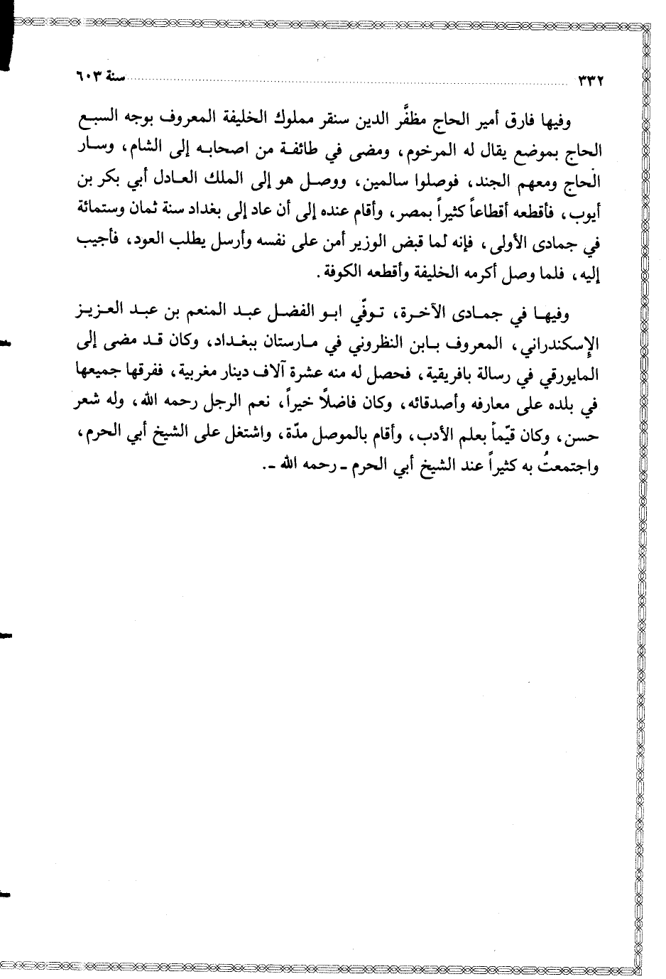 وفيها فارق أمير الحاج مظفر الدين سنقر مملوك الخليفة المعروف بوجه السبع الحاج بموضع يقال له المرخوم ومضى في طائفة من اصحابه إلى الشام وسار الحاج ومعهم الجند فوصلوا سالمين ووصل هو إلى الملك العادل أبي بكر بن أيوب فأقطعه أقطاعا كثيرا بمصر وأقام عنده إلى أن عاد إلى بغداد سنة ثمان وستمائة في جمادى الأولى فإنه لما قبض الوزير أمن على نفسه وأرسل يطلب العود فأجيب إليه فلما وصل أكرمه الخليفة وأقطعه الكوفة