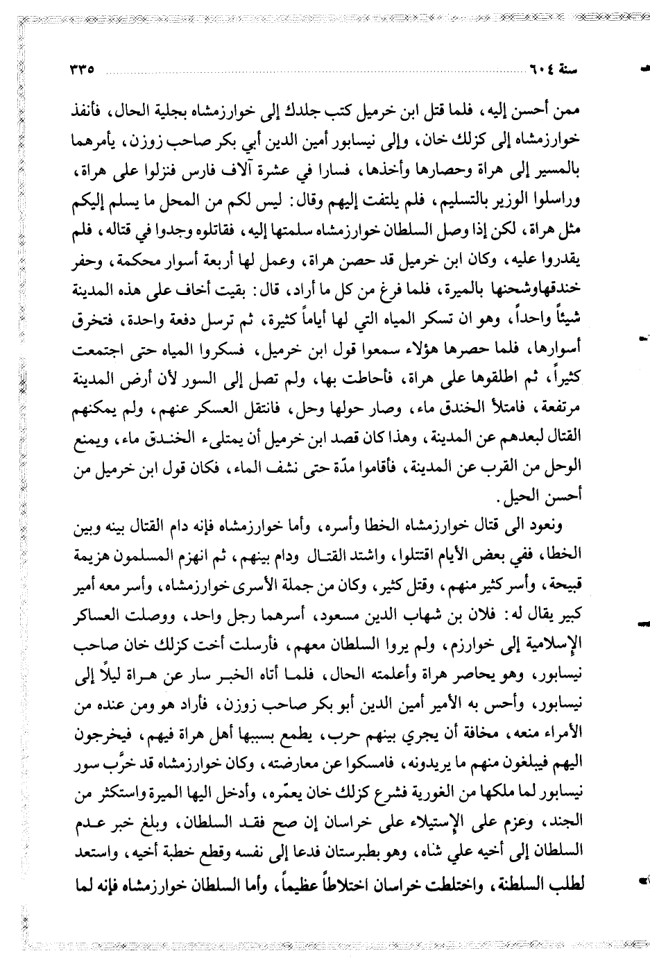 ممن أحسن إليه فلما قتل ابن خرميل كتب جلدك إلى خوارزمشاه بجلية الحال فأنفذ خوارزمشاه إلى كزلك خان وإلى نيسابور أمين الدين أبي بكر صاحب زوزن يأمرهما بالمسير إلى هراة وحصارها وأخذها فسارا في عشرة آلاف فارس فنزلوا على هراة وراسلوا الوزير بالتسليم فلم يلتفت إليهم وقال ليس لكم من المحل ما يسلم إليكم مثل هراة لكن إذا وصل السلطان خوارزمشاه سلمتها إليه فقاتلوه وجدوا في قتاله فلم يقدروا عليه وكان ابن خرميل قد حصن هراة وعمل لها أربعة أسوار محكمة وحفر خندقها وشحنها بالميرة فلما فرغ من كل ما أراد قال بقيت أخاف على هذه المدينة شيئا واحدا وهو ان تسكر المياه التي لها أياما كثيرة ثم ترسل دغعة واحدة فتخرق أسوارها فلما حصرها هؤلاء سمعوا قول ابن خرميل فسكروا المياه حتى اجتمعت مثيرا ثم اطلقوها على هراة فأحاطت بها ولم تصل إلى السور لأن أرض المدينة مرتفعة فامتلأ الخندق ماء وصار حولها وحل فانتقل العسكر عنهم ولم يمكنهم القتال لبعدهم عن المدينة وهذا كان قصد ابن خرميل أن يمتلئ الخندق ماء ويمنع الوحل من القرب عن المدينة فأقاموا مدة حتى نشف الماء فكان قول ابن خرميل من أحسن الحيل