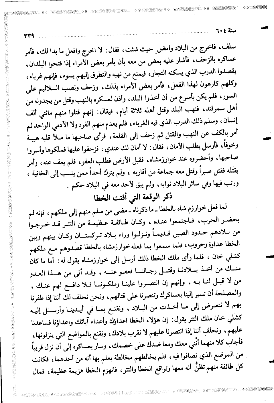 لما فعل خوارزم شاه بالخطا ما ذكرناه مضى من سلم منهم إلى ملكهم فإنه لم يحضر الحرب فاجتمعوا عنده وكان طائفة عظيمة من التتر قد خرجوا من بلادهم حدود الصين قديما ونزلوا وراء بلاد تركستان وكان بينهم وبين الخطا عداوة وحروب فلما سمعوا بما فعله خوارزمشاه بالخطا قصدوهم مع ملكهم كشلي خان فلما رأى ملك الخطا ذلك أرسل إلى خوارزمشاه يقول له أما ما كان منك من أخذ بلادنا وقتل رجالنا فعفو عنه وقد أتى من هذا العدو من لا قبل لنا به وإنهم إن انتصروا علينا وملكونا فلا دافع لهم عنك والمصلحة أن تسير إلينا بعساكرك وتنصرنا على قتالهم ونحن نحلف لك أننا إذا ظفرنا بهم لا نتعرض إلى ما أخذت منالبلاد ونقنع بما في أيدينا وأرسل إليه كشلي خان ملك التتر يقول إن هؤلاء الخطا اعداؤك وأعداء آبائك واعداؤنا فساعدنا عليهم ونحلف أننا إذا انتصرنا عليهم لا تقرب بلادك ونقنع بالمواضع التي ينزلونها فأجاب كلا منهما أنني معك ومعا ضدك على خصمك وسار بعساكره إلى أن نزل قريبا من الموضع الذي تصافوا فيه فلم يخالطهم مخالطة يعلم بها أنه من أحدهما فكانت كل طائفة منهم تظن أنه معها وتواقع الخطا والتتر فانهزم الخطا هزيمة عظيمة فمال