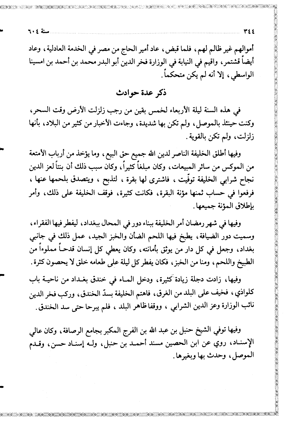 في هذه السنة ليلة الأربعاء لخمس بقين من رجب زلزلت الأرض وقت السحر وكنت حينئذ بالموصل ولم تكن بها شديدة وجاءت الأخبار من كثير من البلاد بأنها زلزلت ولم تكن بالقوية