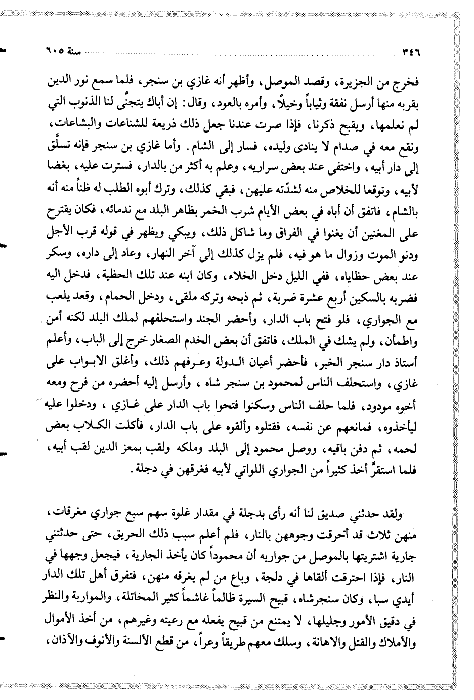 ولقد حدثني صديق لنا أنه رأى بدجلة في مقدار غلوة سهم سبع جواري مغرقات منهن ثلاث قد أحرقت وجوههن بالنار فلم أعلم سبب ذلك الحريق حتى حدثتني جارية اشتريتها بالموصل من جواريه أن محمودا كان يأخذ الجارية فيجعل وجهها في النار فإذا احترقت ألقاها في دلجة وباع من لم يغرقه منهن فتفرق أهل تلك الدار أيدي سبا وكان سنجرشاه قبيح السيرة ظالما غاشما كثير المخاتلة والمواربة والنظر في دقيق الأمور وجليلها لا يمتنع من قبيح يفعله مع رعيته وغيرهم من أخذ الأموال والأملاك والقتل والاهانة وسلك معهم طريقا وعرا من قطع الألسنة والأنوف والآذان