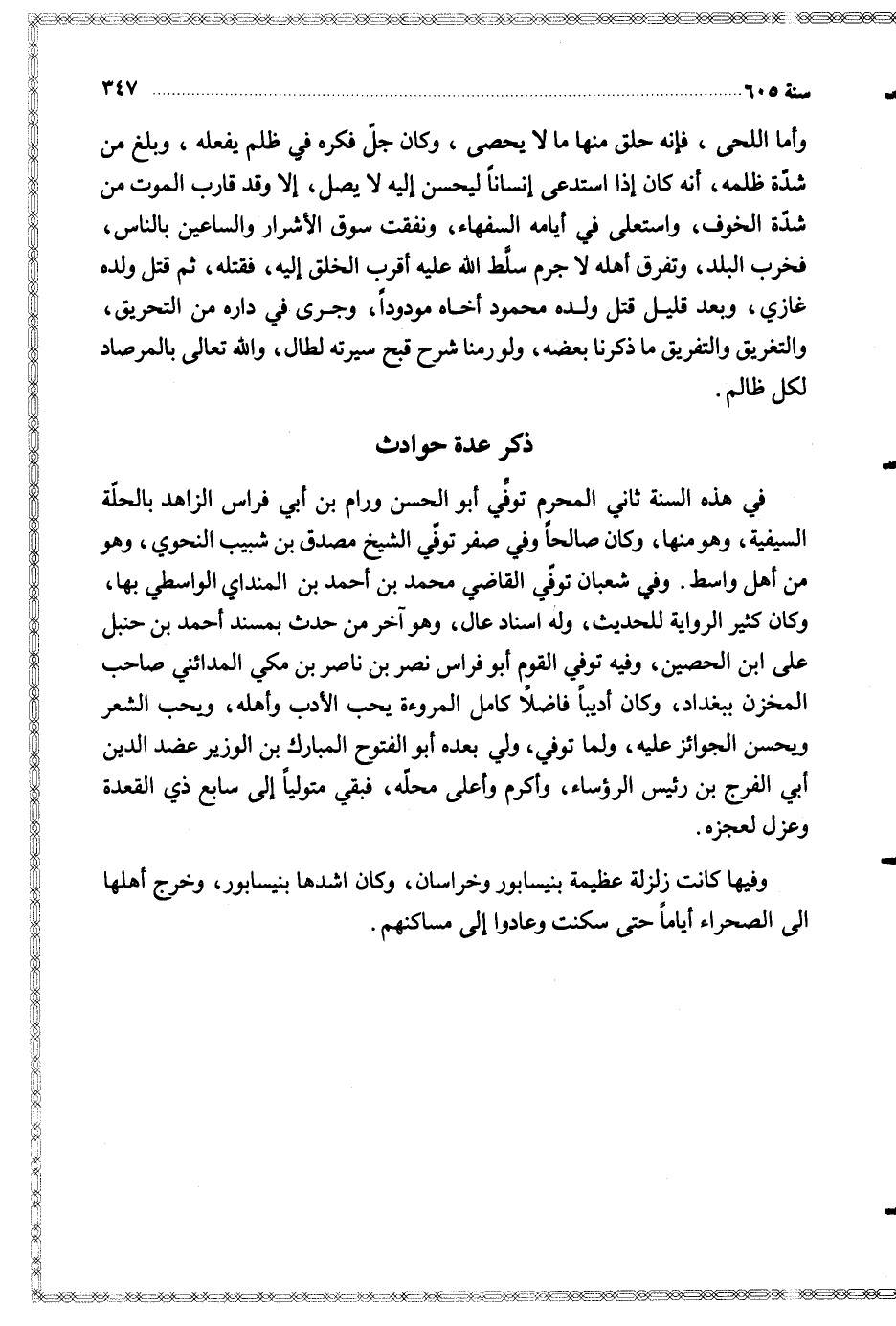 وفيها كانت زلزلة عظيمة بنيسابور وخراسان وكان اشدها بنيسابور وخرج أهلها الى الصحراء أياما حتى سكنت وعادوا إلى مساكنهم
