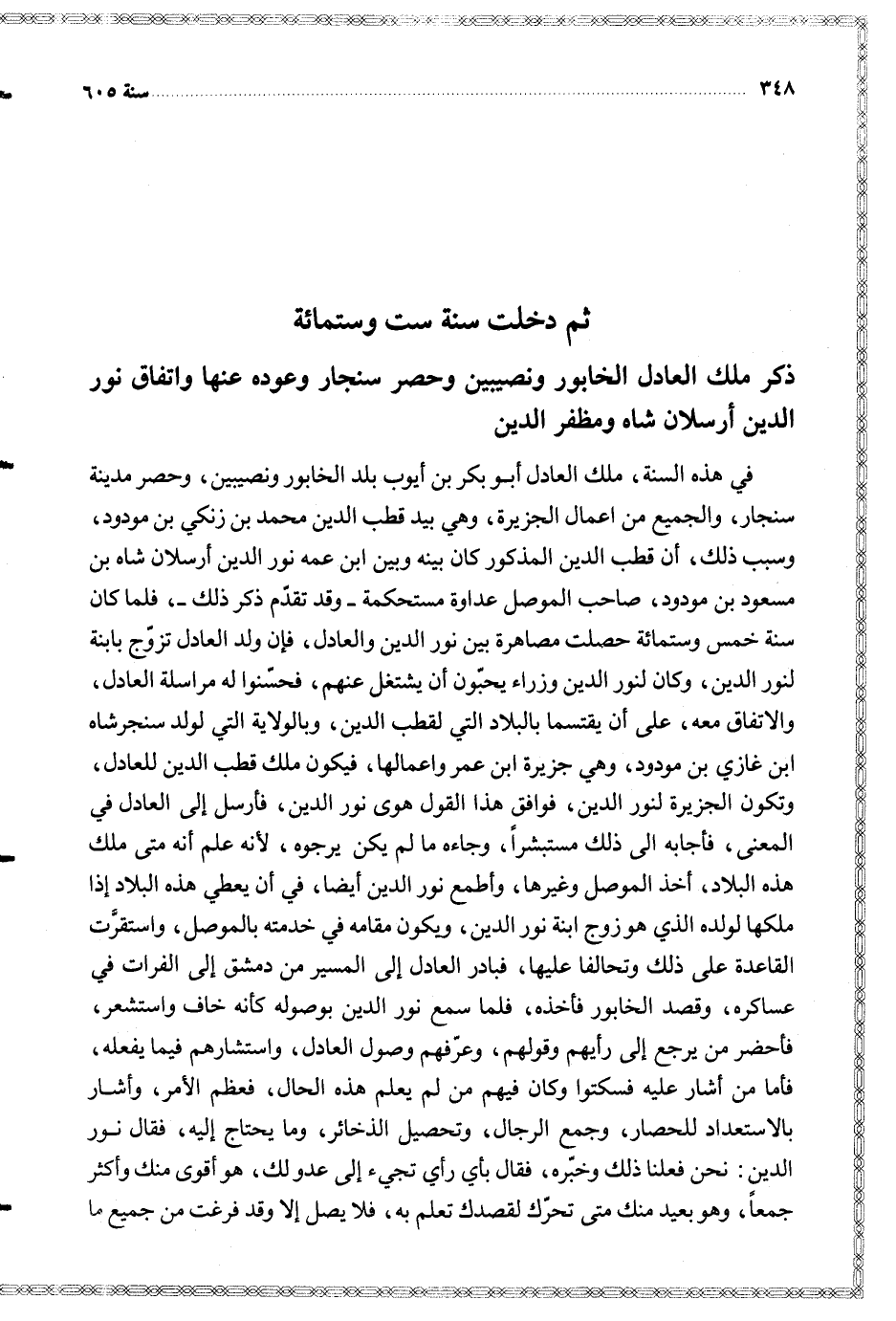 في هذه السنة ملك العادل أبو بكر بن أيوب بلد الخابور ونصيبين وحصر مدينة سنجار والجميع من اعمال الجزيرة وهي بيد قطب الدين محمد بن زنكي بن مودود وسبب ذلك أن قطب الدين المذكور كان بينه وبين ابن عمه نور الدين أرسلان شاه بن مسعود بن مودود صاحب الموصل عداوة مستحكمة وقد تقدم ذكر ذلك فلما كان سنة خمس وستمائة حصلت مصاهرة بين نور الدين والعادل فإن ولد العادل تزوج بابنة لنور الدين وكان لنور الدين وزراء يحبون أن يشتغل عنهم فحسنوا له مراسلة العادل والاتفاق معه على أن يقتسما بالبلاد التي لقطب الدين وبالولاية التي لولد سنجر شاه ابن غازي بن مودود وهي جزيرة ابن عمر واعمالها فيكون ملك قطب الدين للعادل وتكون الجزيرة لنور الدين فوافق هذا القول هوى نور الدين فأرسل إلى العادل في المعنى فأجابه الى ذلك مستبشرا وجاءه ما لم يكن يرجوه لأنه علم أنه متى ملك هذه البلاد أخذ الموصل وغيرها وأطمع نور الدين أيضا في أن يعطي هذه البلاد إذا ملكها لولده الذي هو زوج ابنة نور الدين ويكون مقامه في خدمته بالموصل واستقرت القاعدة على ذلك وتحالفا عليها فبادر العادل إلى المسير من دمشق إلى الفرات في عساكره وقصد الخابور فأخذه فلما سمع نور الدين بوصوله كأنه خاف واستشعر فأحضر من يرجع إلى رأيهم وقولهم وعرفهم وصول العادل واستشارهم فيما يفعله فأما من أشار عليه فسكتوا وكان فيهم من لم يعلم هذه الحال فعظم الأمر وأشار بالاستعداد للحصار وجمع الرجال وتحصيل الذخائر وما يحتاج إليه فقال نور الدين نحن فعلنا ذلك وخبره فقال بأي رأي تجيء إلى عدو لك هو أقوى منك وأكثر جمعا وهو بعيد منك متى تحرك لقصدك تعلم به فلا يصل إلا وقد فرغت من جميع ما