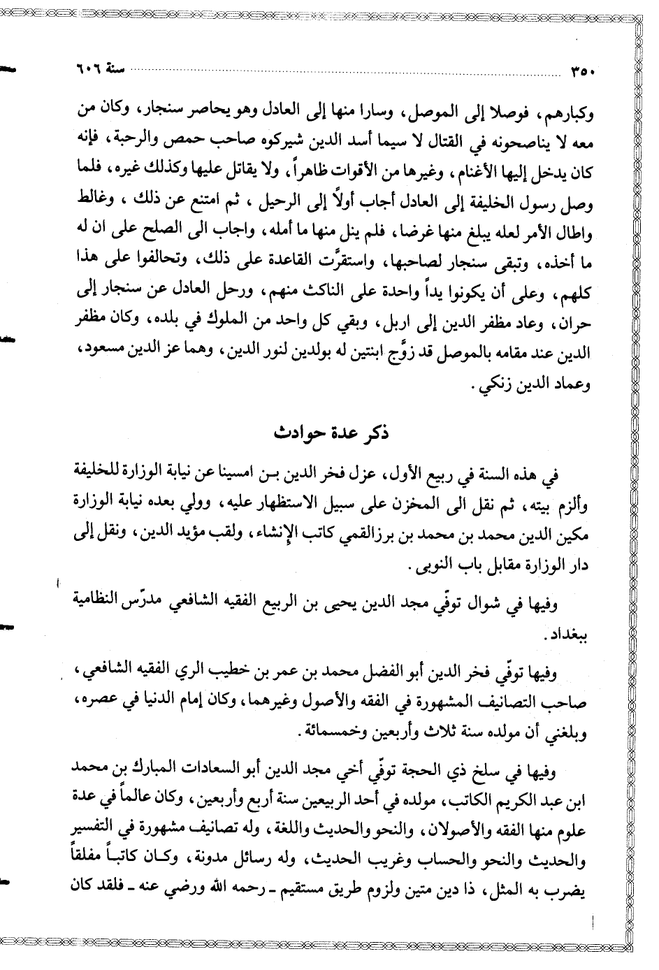 وفيها في سلخ ذي الحجة توفي أخي مجد الدين أبو السعادات المبارك بن محمد ابن عبد الكريم الكاتب مولده في أحد الربيعين سنة أربع وأربعين وكان عالما في عدة علوم منها الفقه والأصولان والنحو والحديث واللغة وله تصانيف مشهورة في التفسير والحديث والنحو والحساب وغريب الحديث وله رسائل مدونة وكان كاتبا مفلقا يضرب به المثل ذا دين متين ولزوم طريق مستقيم رحمه الله ورضي عنه فلقد كان
