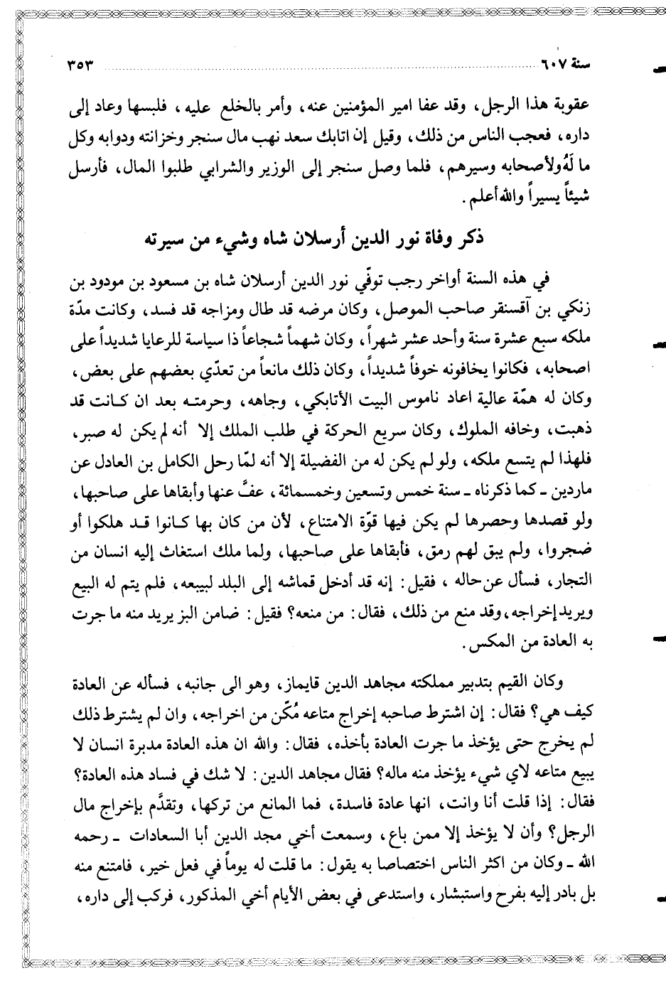 في هذه السنة أواخر رجب توفي نور الدين أرسلان شاه بن مسعود بن مودود بن زنكي بن آقسنقر صاحب الموصل وكان مرضه قد طال ومزاجه قد فسد وكانت مدة ملكه سبع عشرة سنة وأحد عشر شهرا وكان شهما شجاعا ذا سياسة للرعايا شديدا على اصحابه فكانوا يخافونه خوفا شديدا وكان ذلك مانعا من تعدي بعضهم على بعض وكان له همة عالية اعاد ناموس البيت الأتابكي وجاهه وحرمته بعد ان كانت قد ذهبت وخافه الملوك وكان سريع الحركة في طلب الملك إلا أنه لم يكن له صبر فلهذا لم يتسع ملكه ولو لم يكن له من الفضيلة إلا أنه لما رحل الكامل بن العادل عن ماردين كما ذكرناه سنة خمس وتسعين وخمسمائة عف عنها وأبقاها على صاحبها ولو قصدها وحصرها لم يكن فيها قوة الامتناع لأن من كان بها كانوا قد هلكوا أو ضجروا ولم يبق لهم رمق فأبقاها على صاحبها ولما ملك استغاث إليه انسان من التجار فسأل عن حاله فقيل إنه قد أدخل قماشه إلى البلد لبيبعه فلم يتم له البيع ويريد إخراجه وقد منع من ذلك فقال من منعه فقيل ضامن البز يريد منه ما جرت به العادة من المكس