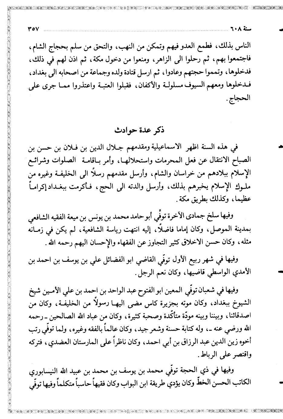 الناس بذلك فطمع العدو فيهم وتمكن من النهب والتحق من سلم بحجاج الشام فاجتمعوا بهم ثم رحلوا الى الزاهر ومنعوا من دخول مكة ثم اذن لهم في ذلك فدخوها وتمموا حجتهم وعادوا ثم ارسل قتادة ولده وجماعة من اصحابه الى بغداد فدخلوها ومعهم السيوف مسلولة والأكفان فقبلوا العتبة واعتذروا مما جرى على الحجاج