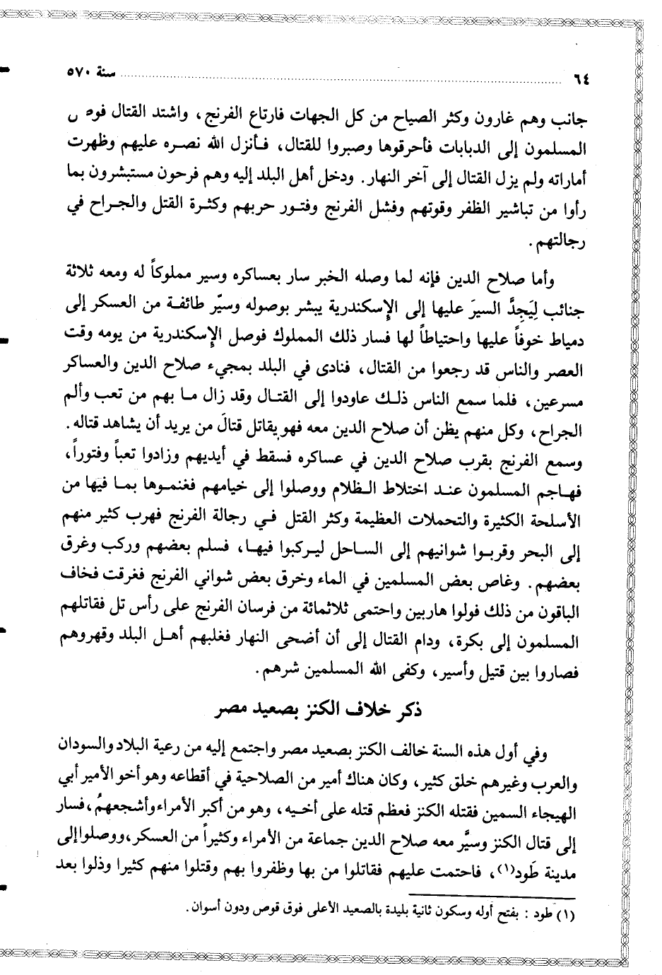وفي أول هذه السنة خالف الكنز بصعيد مصر واجتمع إليه من رعية البلاد والسودان والعرب وغيرهم خلق كثير وكان هناك أمير من الصلاحية في أقطاعه وهو أخو الأمير أبي الهيجاء السمين فقتله الكنز فعظم قتله على أخيه وهو من أكبر الأمراء وأشجعهم فسار إلى قتال الكنز وسير معه صلاح الدين جماعة من الأمراء وكثيرا من العسكر ووصلوا إلى مدينة طود فاحتمت عليهم فقاتلوا من بها وظفروا بهم وقتلوا منهم كثيرا وذلوا بعد