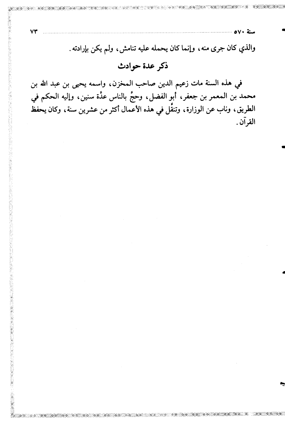 في هذه السنة مات زعيم الدين صاحب المخزن واسمه يحيى بن عبد الله بن محمد بن المعمر بن جعفر أبو الفضل وحج بالناس عدة سنين وإليه الحكم في الطريق وناب عن الوزارة وتنقل في هذه الأعمال أكثر من عشرين سنة وكان يحفظ القرآن