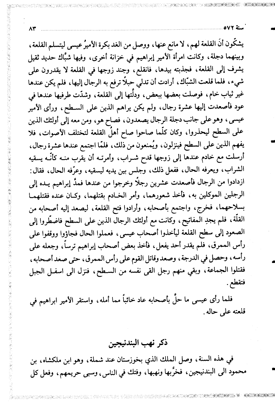 يشكون أن القلعة لهم لا مانع عنها ووصل من الغد بكرة الأمير عيسى ليتسلم القلعة وبينهما دجلة وكانت امرأة الأمير إبراهيم في خزانة أخرى وفيها شباك حديد ثقيل يشرف إلى القلعة فجذبته بيدها فانقلع وجند زوجها في القلعة لا يقدرون على شيء فلما قلعت الشباك أرادت أن تدلي حبلا ترفع به الرجال إليها فلم يكن عندها غير ثياب خام فوصلت بعضها ببعض ودلتها إلى القلعة وشدت طرفيها عندها في عود فأصعدت إليها عشرة رجال ولم يكن يراهم الذين على السطح ورأى الأمير عيسى وهو على جانب دجلة الرجال يصعدون فصاح هو ومن معه إلى أولئك الذين على السطح ليحذروا وكان كلما صاحوا صاح أهل القلعة لتختلف الأصوات فلا يفهم الذين على السطح فينزلون ويمنعون من ذلك فلما اجتمع عندها عشرة رجال أرسلت مع خادم عندها إلى زوجها قدح شراب وأمرته أن يقرب منه كأنه يسقيه الشراب ويعرفه الحال ففعل ذلك وجلس بين يديه ليسقيه وعرفه الحال فقال ازدادوا من الرجال فأصعدت عشرين رجلا وخرجوا من عندها فمد إبراهيم يده إلى الرجلين الموكلين به فأخذ شعورهما وأمر الخادم بقتلهما وكان عنده فقتلهما بسلاجهما فخرج واجتمع بأصحابه وأرادوا فتح القلعة ليصعد إليه أصحابه من القلة فلم يجد المفاتيح وكانت مع أولئك الرجال الذين على السطح فاضطروا إلى الصعود إلى سطح القلعة ليأخذوا أصحاب عيسى فعملوا الحال فجاؤوا ووقفوا على رأس الممرق فلم يقدر أحد يفعل فأخذ بعض أصحاب إبراهيم ترسا وجعله على رأسه وحصل في الدرجة وصعد وقاتل القوم على رأس الممرق حتى صعد أصحابه فقتلوا الجماعة وبقي منهم رجل القى نفسه من السطح فنزل الى اسفل الجبل فتقطع