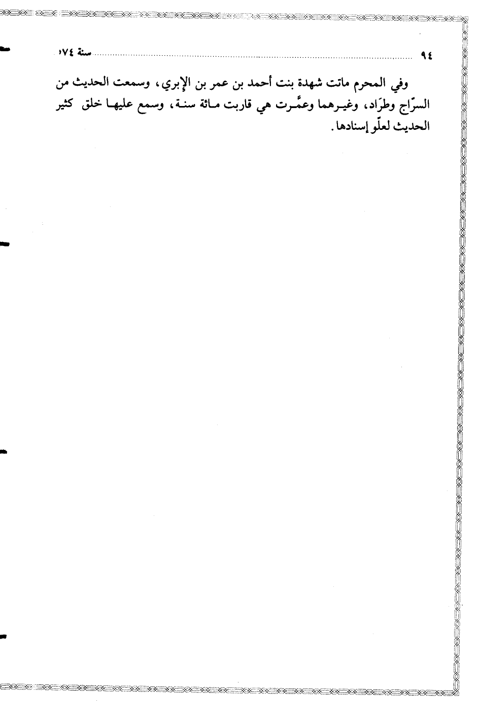 وفي المحرم ماتت شهدة بنت أحمد بن عمر بن الإبري وسمعت الحديث من السراج وطراد وغيرهما وعمرت هي قاربت مائة سنة وسمع عليها خلق كثير الحديث لعلو إسنادها