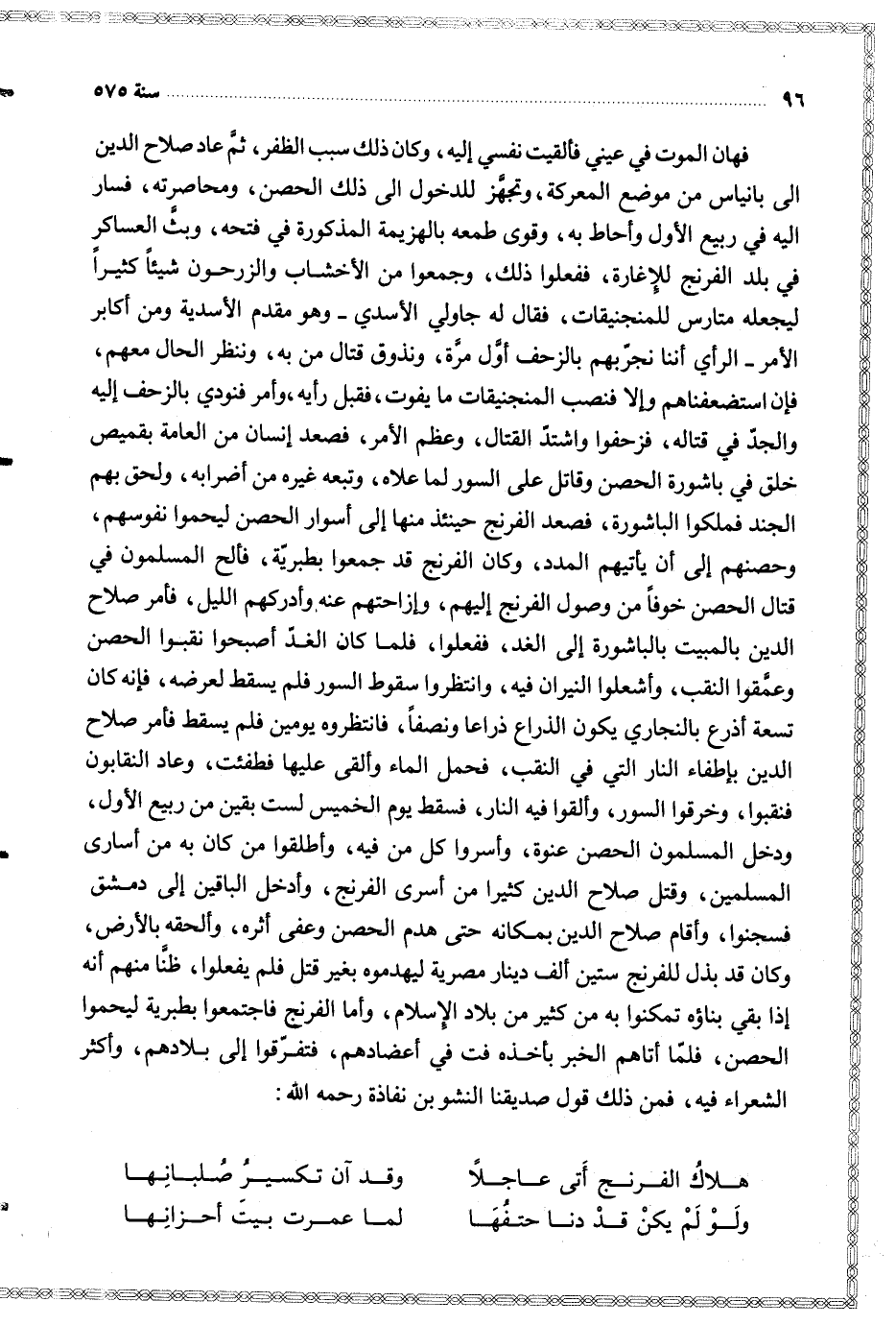 ( هلاك الفرنج أتى عاجلا ... وقد آن تكسير صلبانها )