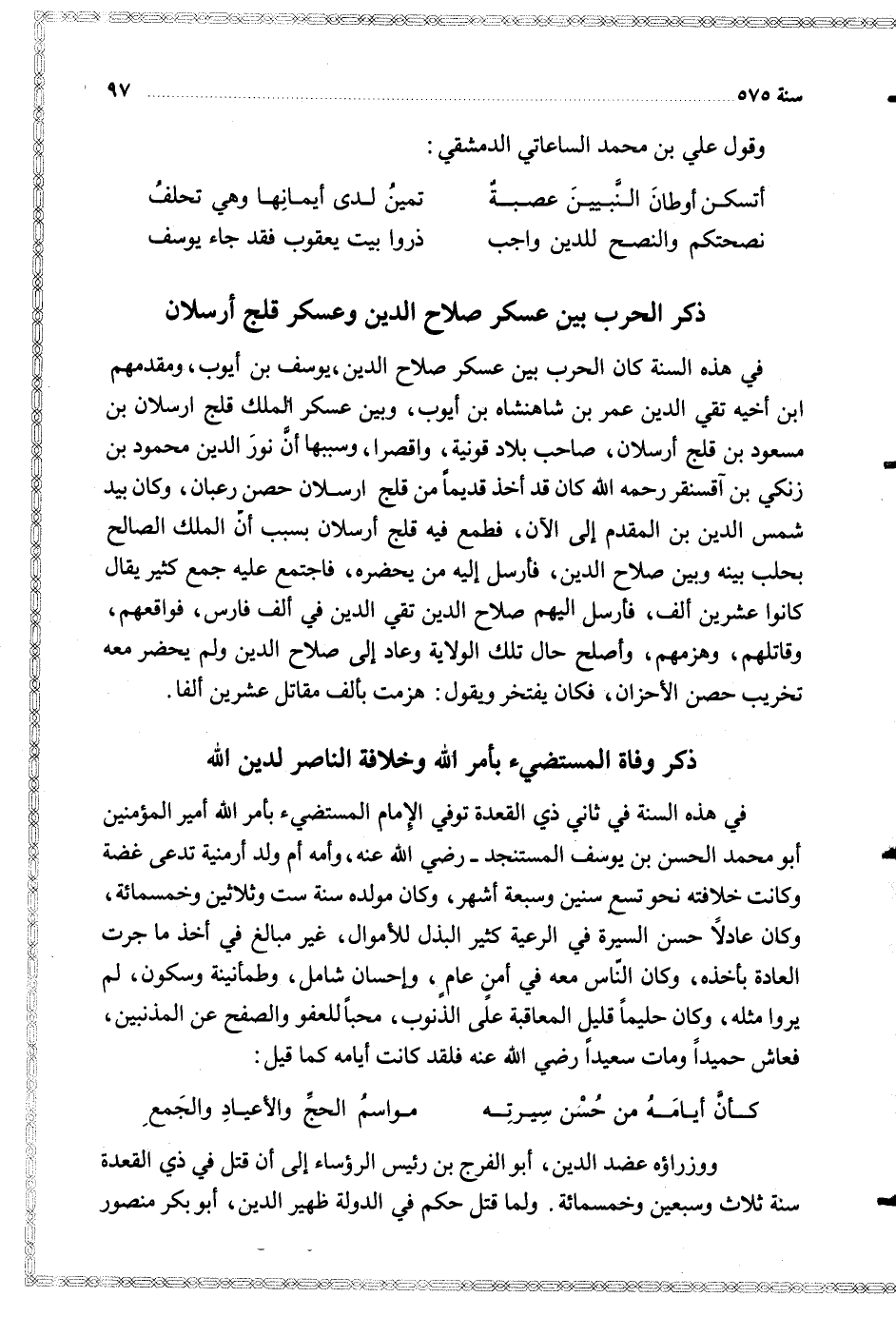 في هذه السنة هبت ريح سوداء مظلمة بالديار الجزرية والعراق وغيرها وعمت أكثر البلاد من الظهر إلى أن مضى من الليل ربعه وبقيت الدنيا مظلمة لا يكاد الإنسان يبصر صاحبه وكنت حينئذ بالموصل فصلينا العصر والمغرب والعشاء الآخرة على الظن والتخمين وأقبل الناس على التضرع والتوبة والاستغفار وظنوا أن القيامة قد قامت فلما مضى مقدار ثلث الليل زال ذلك الظلام والعتمة التي غطت السماء فنظرنا فرأينا النجوم فعلمنا مقدار ما مضى من الليل لأن الظلام لم يزد بدخول الليل وكان كل من يصل من جهة من الجهات يخبر بمثل ذلك