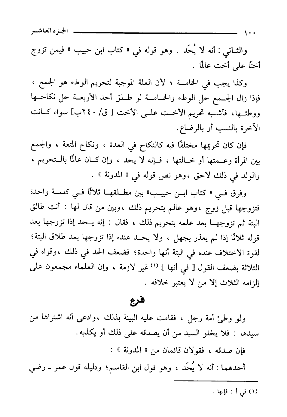 فإن كان تحريمها مختلفًا فيه كالنكاح في العدة، ونكاح المتعة، والجمع بين المرأة وعمتها أو خالتها، فإنه لا يحد، وإن كان عالمًا بالتحريم، والولد في ذلك لاحق، وهو نص قوله في "المدونة".
