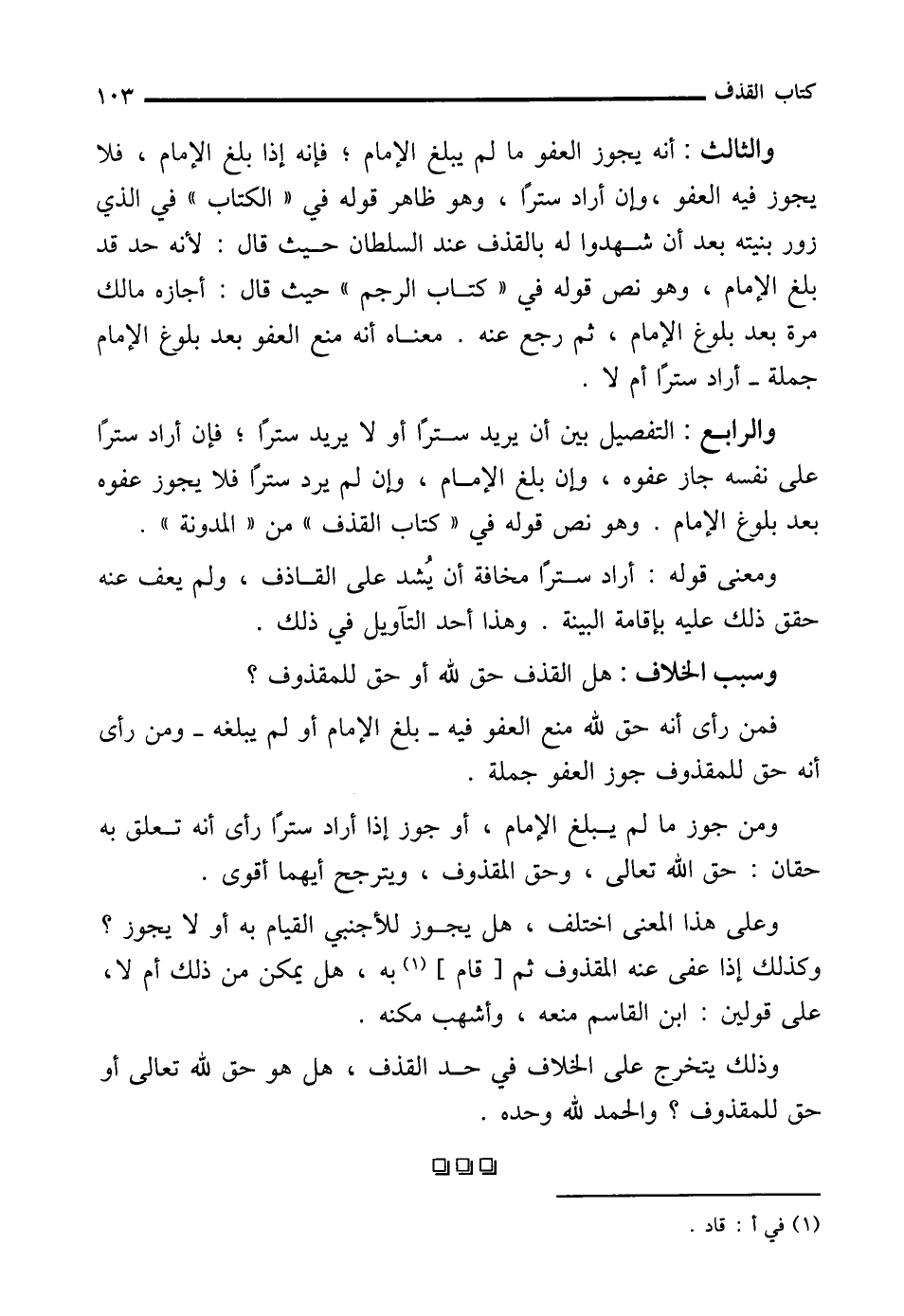 والرابع: التفصيل بين أن يريد سترًا أو لا يريد سترًا؛ فإن أراد سترًا على نفسه جاز عفوه، وإن بلغ الإِمام، وإن لم يرد سترًا فلا يجوز عفوه بعد بلوغ الإِمام. وهو نص قوله في "كتاب القذف" من "المدونة".