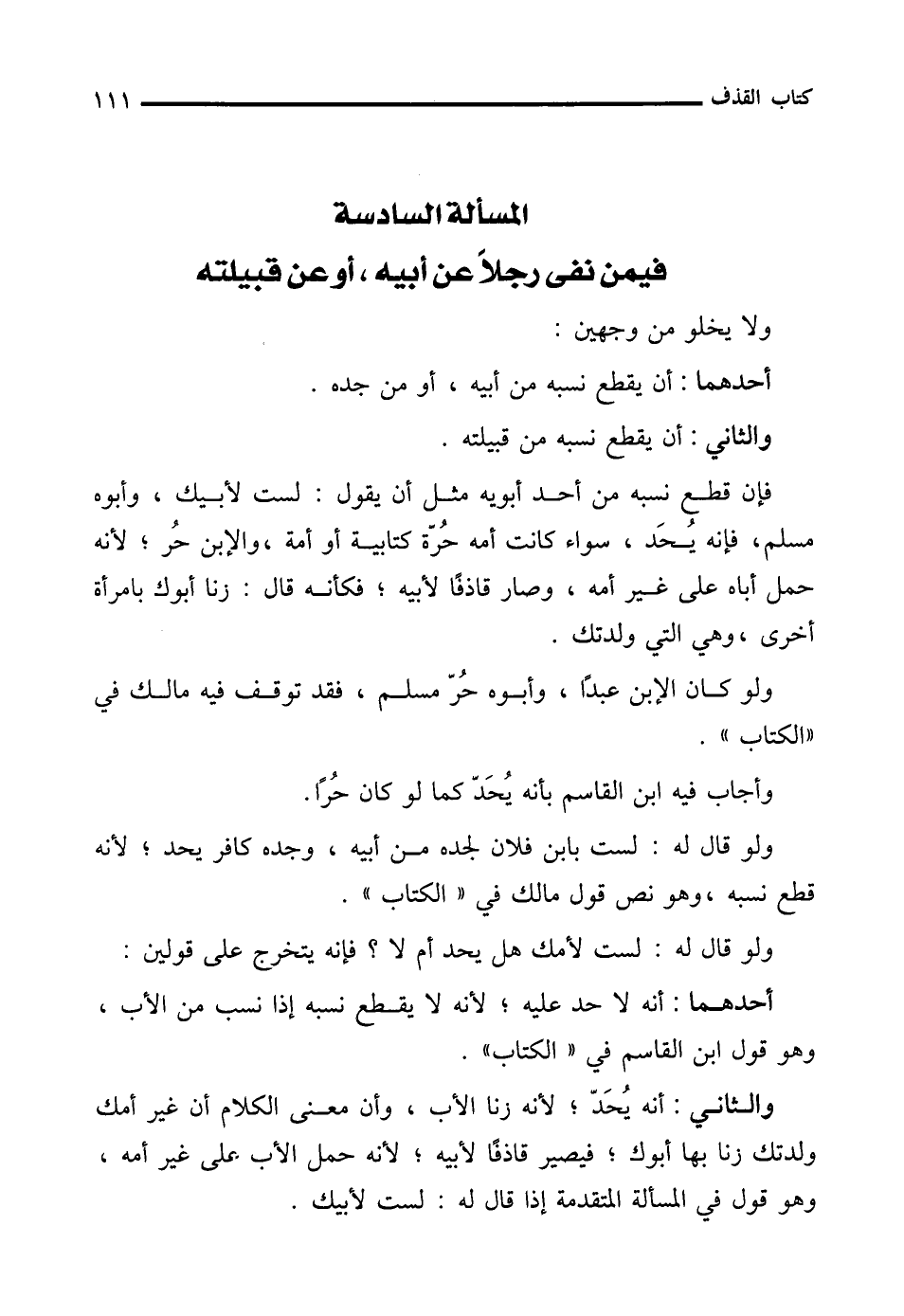 المسألة السادسة فيمن نفى رجلًا عن أبيه، أو عن قبيلته