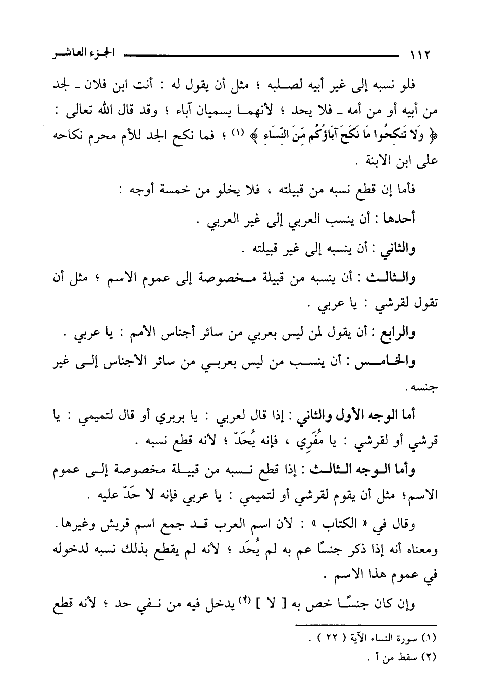 والخامس: أن ينسب من ليس بعربي من سائر الأجناس إلى غير جنسه.