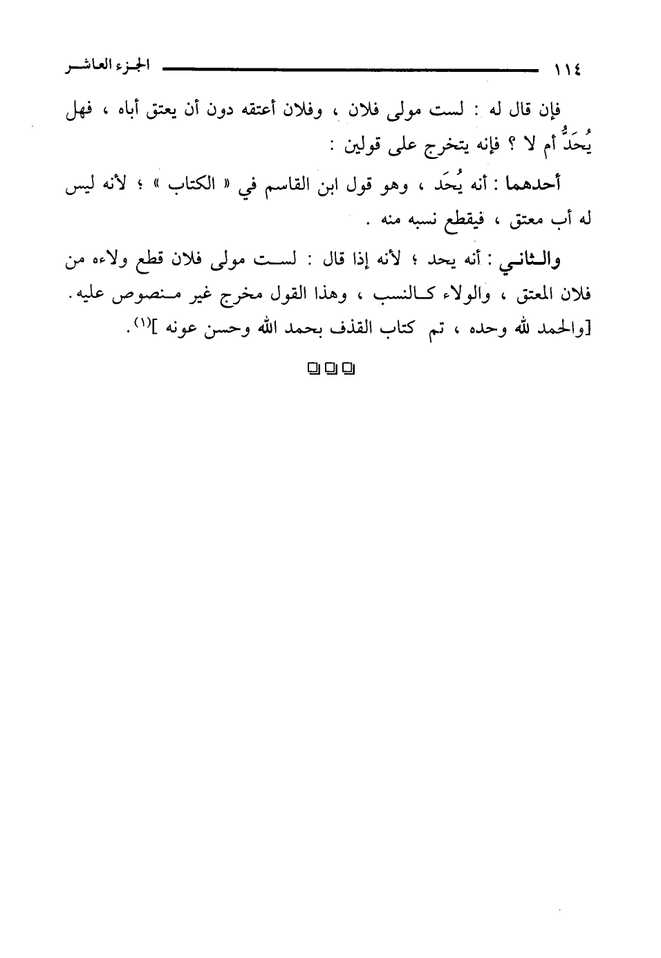 والثاني: أنه يحد؛ لأنه إذا قال: لست مولى فلان قطع ولاءه من فلان العتق، والولاء كالنسب، وهذا القول مخرج غير منصوص عليه. [والحمد لله وحده، تم كتاب القذف بحمد الله وحسن عونه].