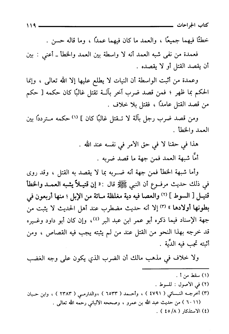 وأما شبهة الخطأ فمن جهة أنه ضربه بما لا يقصد به القتل، وقد روى في ذلك حديث مرفوع أن النبي - صلى الله عليه وسلم - قال: "إن قتيلًا يشبه العمد والخطأ قتيل [السوط] (¬2) والعصا فيه دية مغلظة مائة من الإبل؛ منها أربعون في بطونها أولادها" (¬3) إلا أنه حديث مضطرب عند أهل الحديث لا يثبت من جهة الإسناد فيما ذكره أبو عمر ابن عبد البر (¬4)، وإن كان أبو داود وغيره قد خرجه بهذا النحو من القتل عند من لم يثبته يجب فيه القصاص، ومن أثبته تجب فيه الدِّية.
