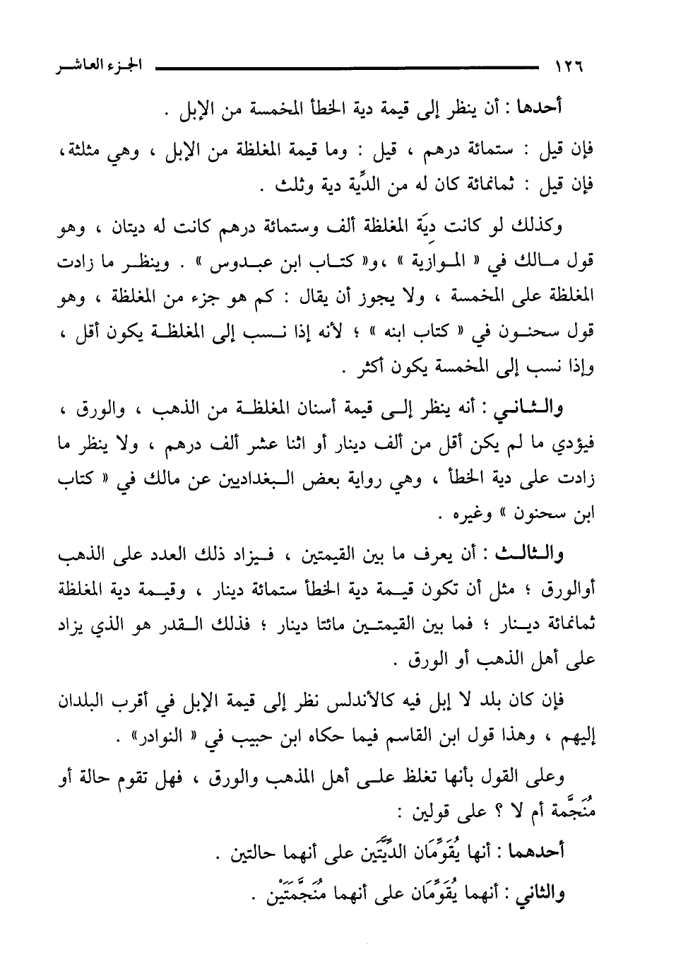 والثالث: أن يعرف ما بين القيمتين، فيزاد ذلك العدد على الذهب أو الورق؛ مثل أن تكون قيمة دية الخطأ ستمائة دينار، وقيمة دية المغلظة ثمانمائة دينار؛ فما بين القيمتين مائتا دينار؛ فذلك القدر هو الذي يزاد على أهل الذهب أو الورق.