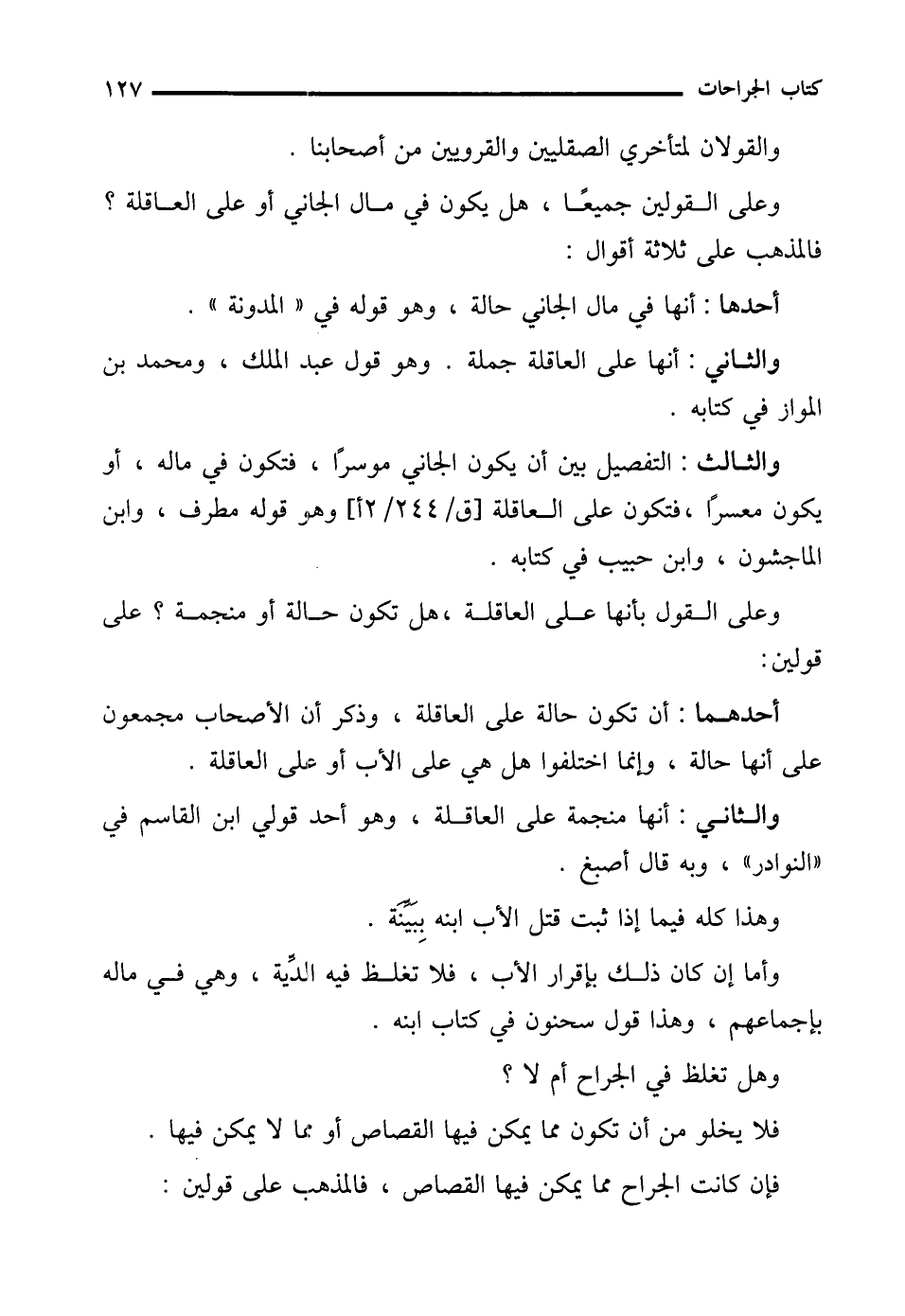 وعلى القولين جميعًا، هل يكون في مال الجاني أو علي العاقلة؟ فالمذهب على ثلاثة أقوال: